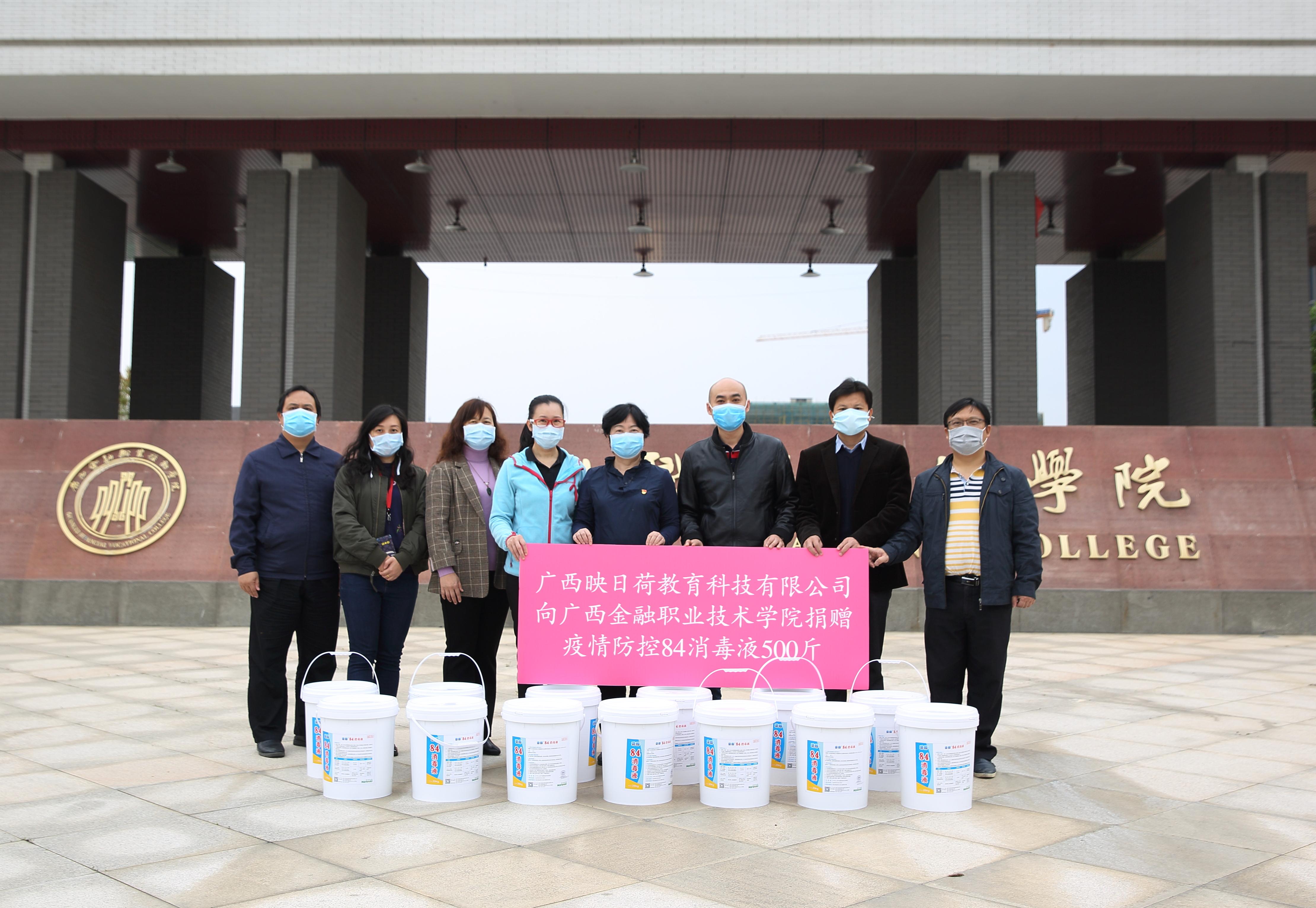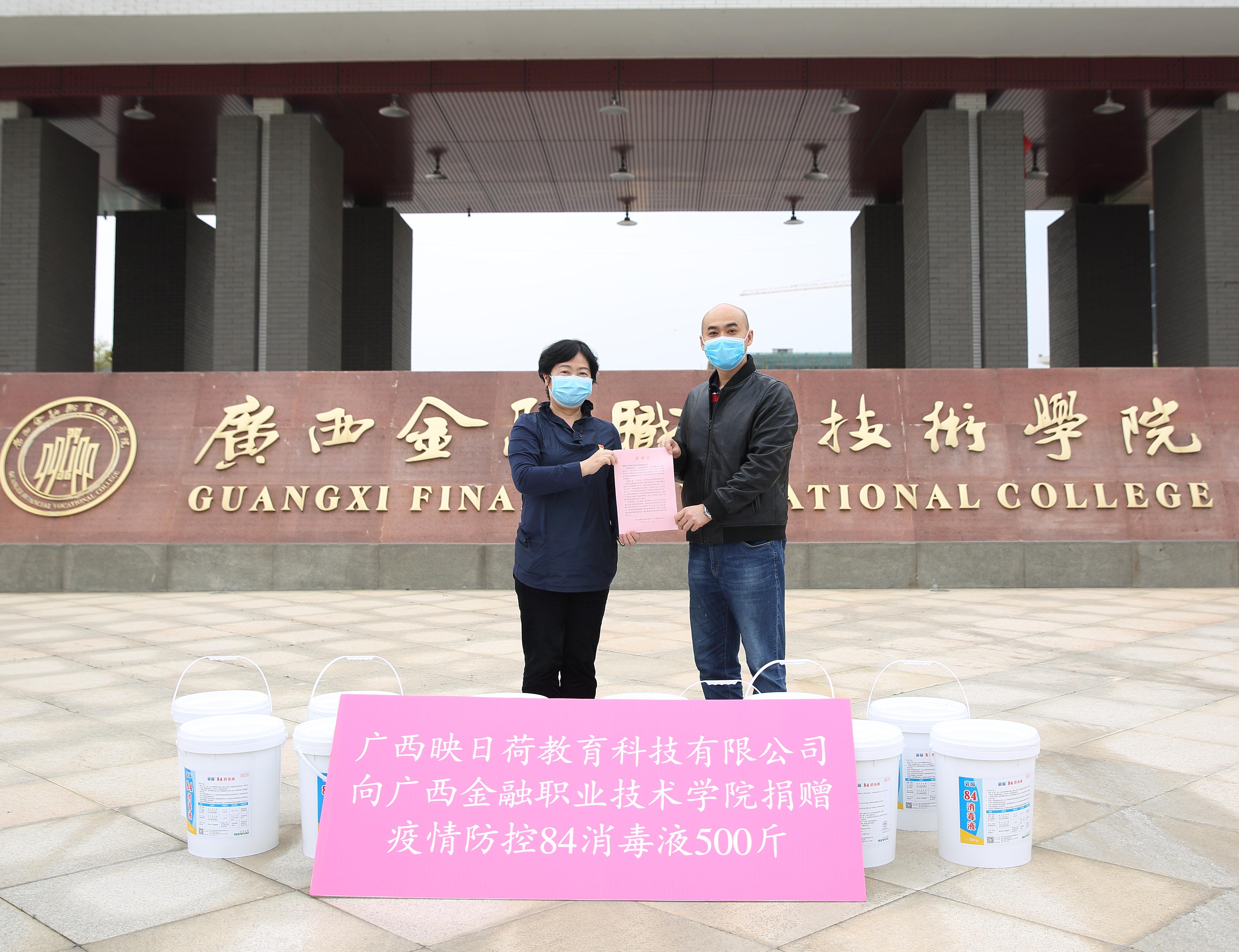关爱学生,关注教育。3月11日上午,爱心企业广西映日荷教育科技有限公司总经理龙凌,副总经理黄隆宾等一行5人带着浓浓爱心和满满的防疫物资来到广西金融职业技术学院,向我校捐赠了500斤84消毒液,用于我校新冠肺炎疫情防控工作。学校党委书记沈立君代表学校接受捐赠并表示感谢,相关部门负责人一同参加了捐赠活动。