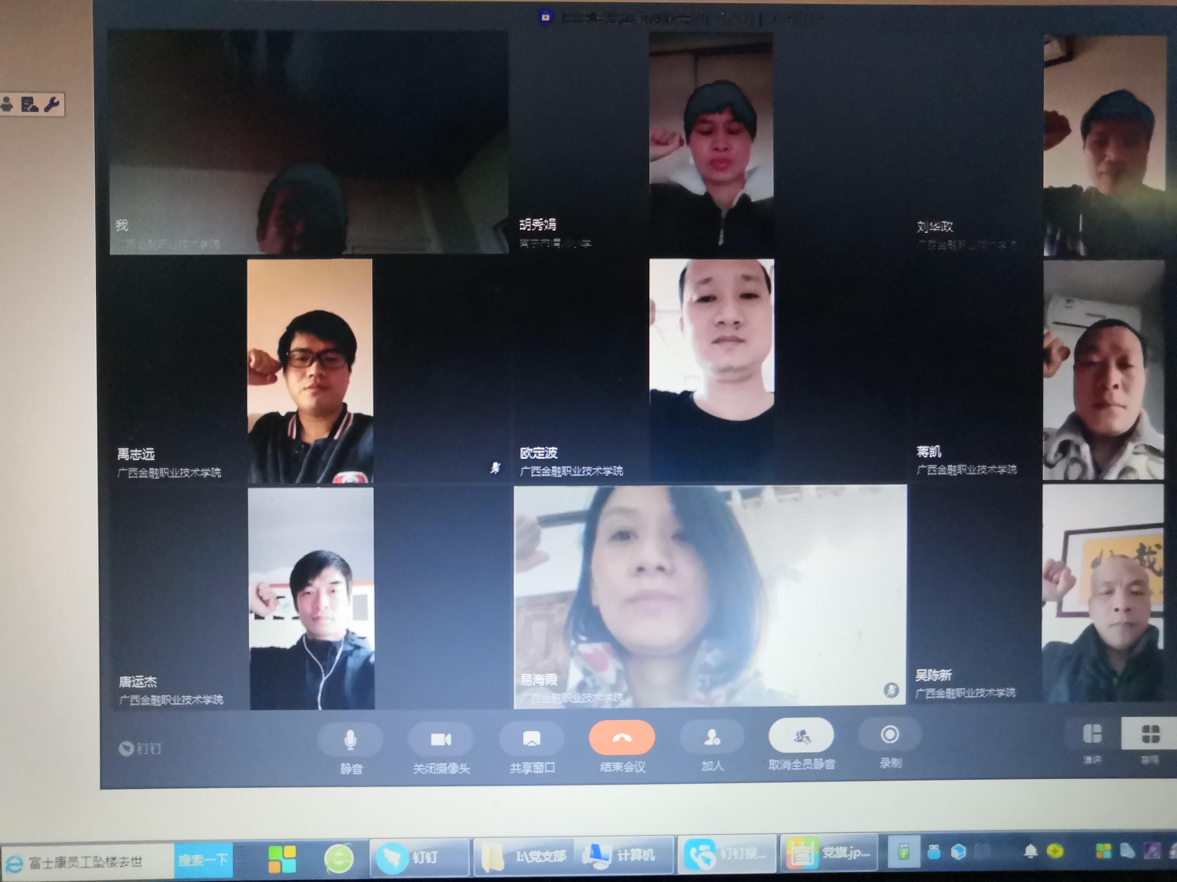 会议传达了学校党委下发的《关于在新型冠状病毒感染的肺炎疫情防控中充分发挥基层党组织战斗堡垒作用和共产党员先锋模范作用的通知》(桂金职院党〔2020〕12号)、《关于在全校深入开展“抗击疫情 党员先行”主题党日活动的实施方案》的通知》(桂金职院党〔2020〕5号)文件精神,要求党员同志要深入贯彻习近平总书记关于新型冠状病毒感染的肺炎疫情防控工作的重要指示精神,全面落实党中央和自治区关于疫情防控的决策部署。支部党员紧紧围绕“抗击疫情 党员先行”主题,通过网络视频进行发言,以身边的事例,高度赞扬在疫情期间许多党员同志发挥的先锋模范作用,纷纷表示,防控就是责任,要在自己的工作岗位上发扬“不忘初心、牢记使命”的精神,以身边优秀党员为榜样完成疫情期间各项工作,充分发挥共产党员该有的担当。