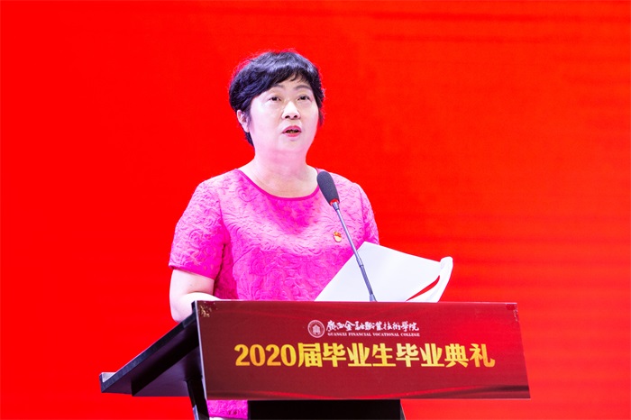 沈立君书记对2020届毕业生表达了不舍和真挚的祝福。她说,同学们是学校改革发展的见证人、推动者,三年的青葱岁月,虽即将划上句号,但未来之路即将在你们脚下展开,请同学们保持求学初心,不忘来时之路,永葆昂扬斗志,实现自我超越。今天的“华丽转身”,成为了金院最年轻的校友,希望同学们今后初心如磐,秉承家国情怀;追求卓越,坚持创新发展;志成高远,秉持诚信笃行。每一位同学都能成为有理想、有本领、有担当的新时代青年,在艰苦奋斗中砥砺前行,在社会磨练中激起最美的浪花,在创新创业中增长才干,不惧风雨、勇挑重担,成就事业的“金色华章”。