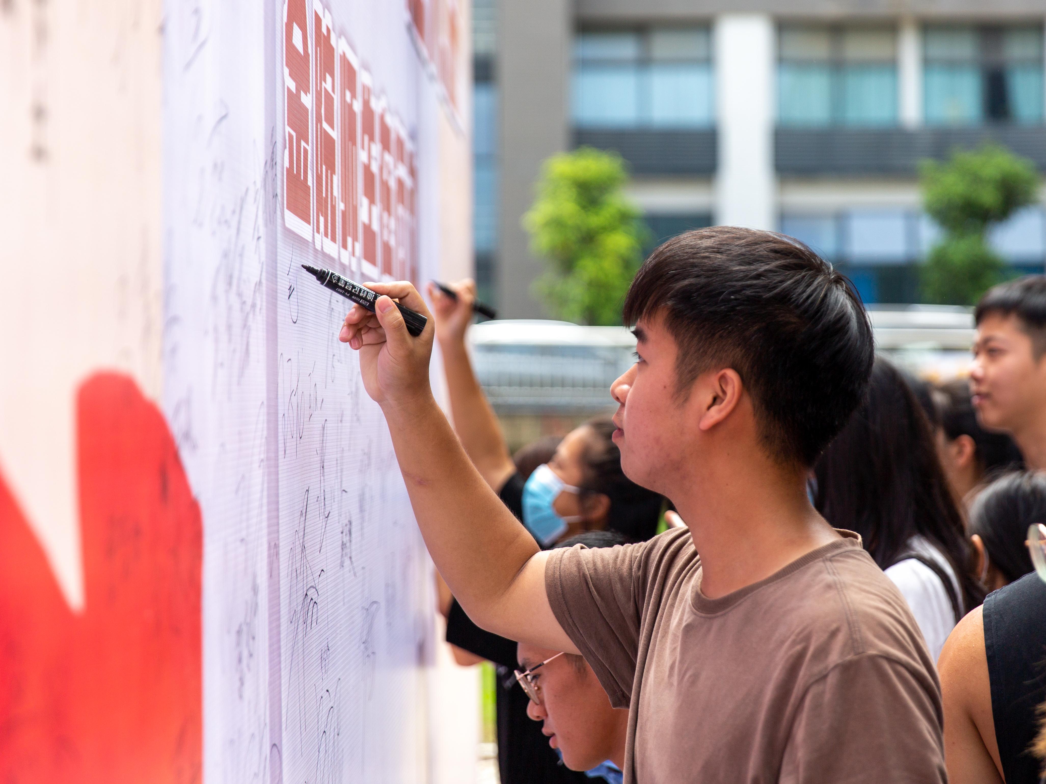 活动最后,全体师生在“签名墙”签名、合影。本次活动以“杜绝浪费·一起光盘”为目标,呼吁金院师生严格要求自己,切实培养节约习惯,用生活演绎文明,用行动展示风范。