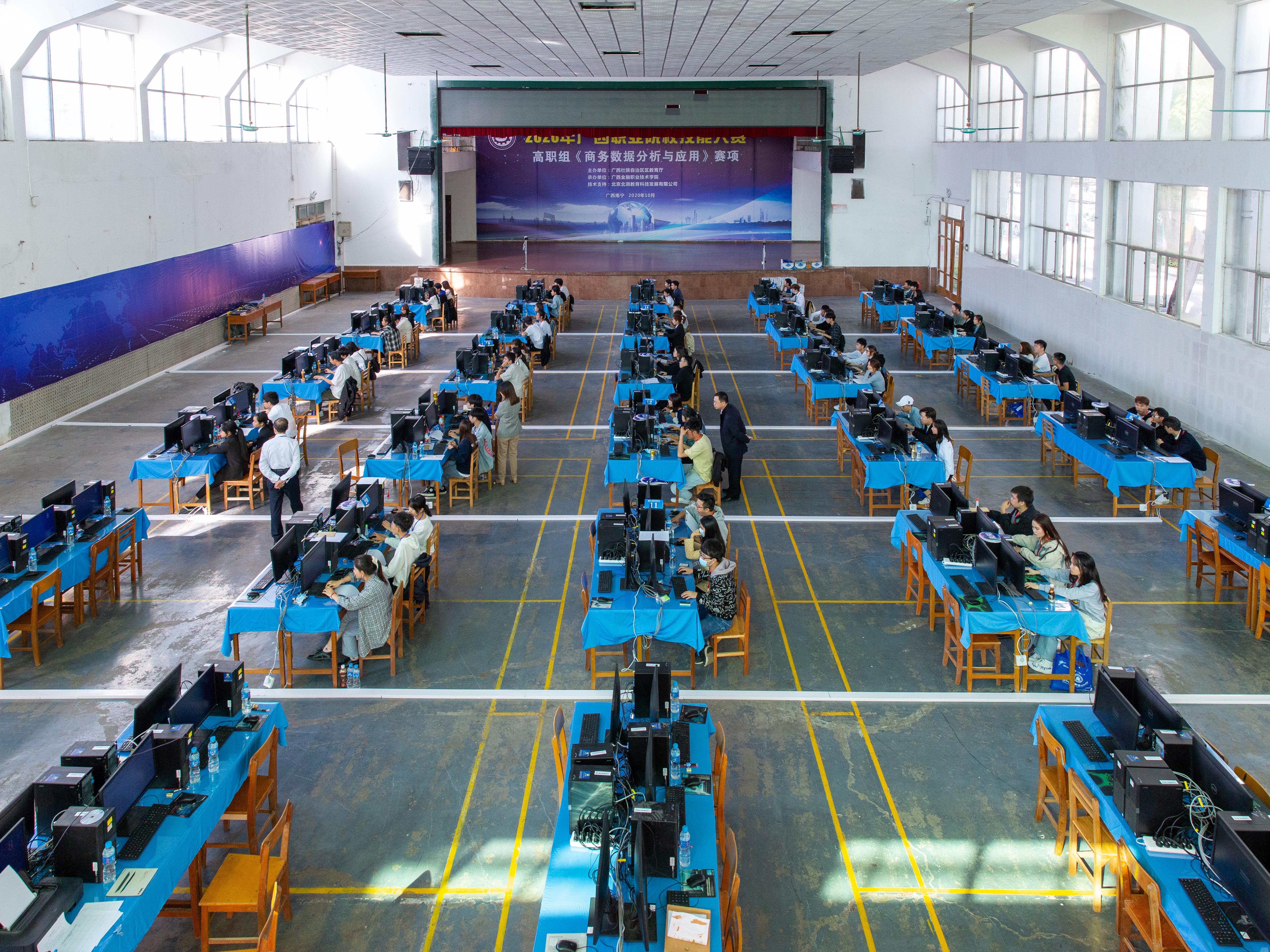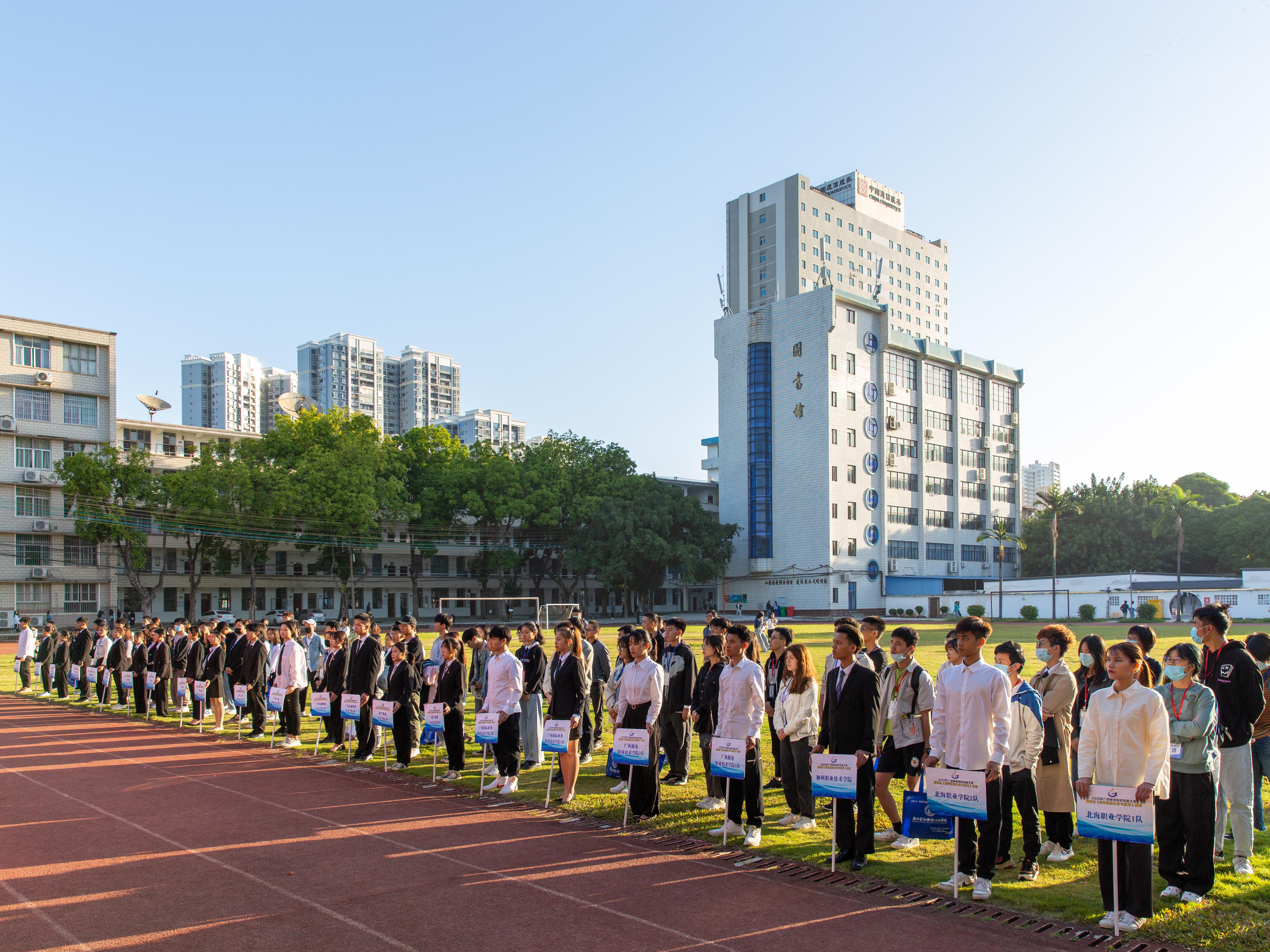 10月23日上午,由自治区教育厅主办,我校承办的2020年广西职业院校技能大赛高职组《商务数据分析与应用》赛项在我校东校区足球场隆重举行。学院院长莫海燕、北京北测数字技术有限公司商务数据分析项目总监王焱总监以及来自全区14所高职院校,25支参赛队的100名选手和指导老师、赛项裁判组成员参加了开幕式。