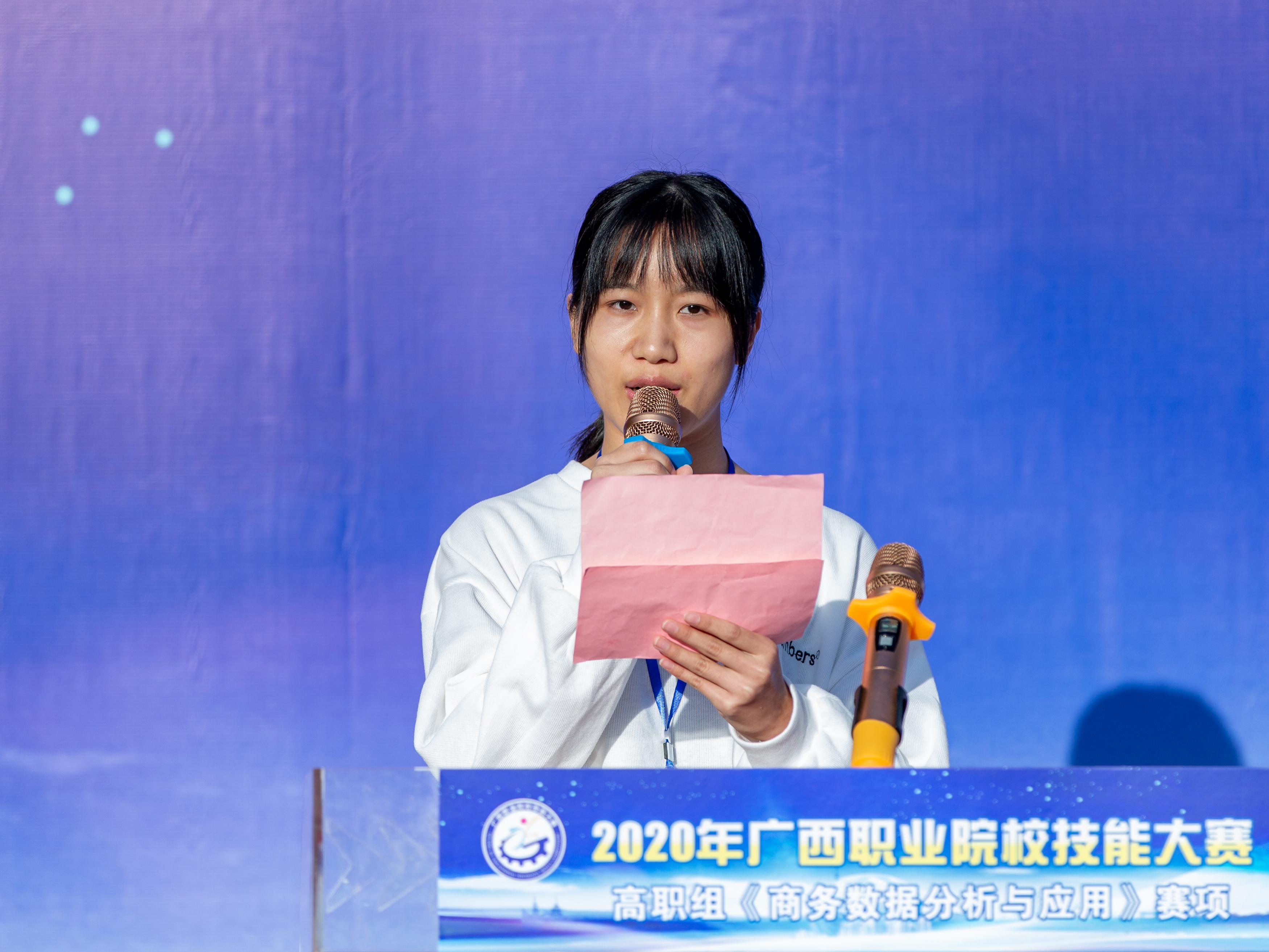 莫海燕院长在开幕式上致辞,她指出,随着电子商务的迅速发展,大数据在商务领域的应用越来越彰显其优势。“商务数据分析与应用”技能已成为电子商务从业人员的核心能力,我区首次将“商务数据分析与应用"列入高职组赛项,不仅是为国赛储备选手,也是为我区职业院校电子商务专业师生切磋技艺和交流经验提供平台,引领学生磨炼技能、锤炼本领,践行大国“工匠精神”,更重要的是适应广西数字经济产业发展需求,促进我区商务大数据高技能人才的成长成才,为建设壮美广西、共圆复兴梦想贡献力量。同时希望工作人员和裁判员严格遵守竞赛规则,坚持公平、公正、公开的原则,认真负责,一丝不苟,坚守岗位,公正裁判,确保大赛顺利进行。