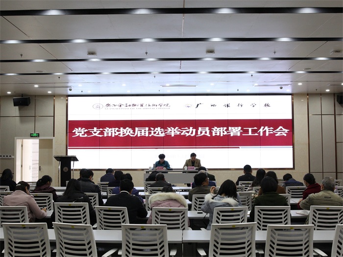 会上,沈立君书记传达了《关于印发<中共广西金融职业技术学院(广西银行学校)委员会党支部换届选举工作方案>的通知》,就如何做好党支部换届选举工作从指导思想、组织领导、基本要求和原则、时间安排和主要程序以及内容等方面提出了实施意见。刘华政副书记宣读了《关于调整优化党支部设置的通知》。