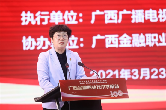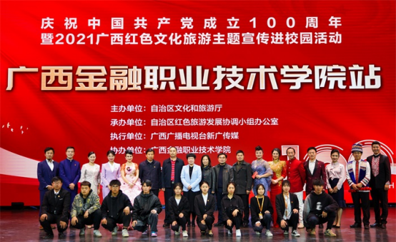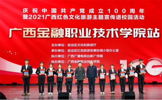 百年征程波澜壮阔,百年初心历久弥坚。为庆祝中国共产党成立100周年,向党的百年华诞献礼,由自治区文化和旅游厅主办、自治区红色旅游发展协调小组办公室承办、广西广播电视台新广传媒执行、我校协办的庆祝中国共产党成立100周年暨2021广西红色文化旅游主题宣传教育进校园活动于2021年3月23日在我校西校区国际会议中心举行。我校领导,自治区红色旅游发展协调小组办公室副主任、二级调研员刘瑜明,广西广播电视台新光传媒总经理陈冬博以及自治区红色旅游发展协调小组办公室一级主任科员吕国宁出席活动。