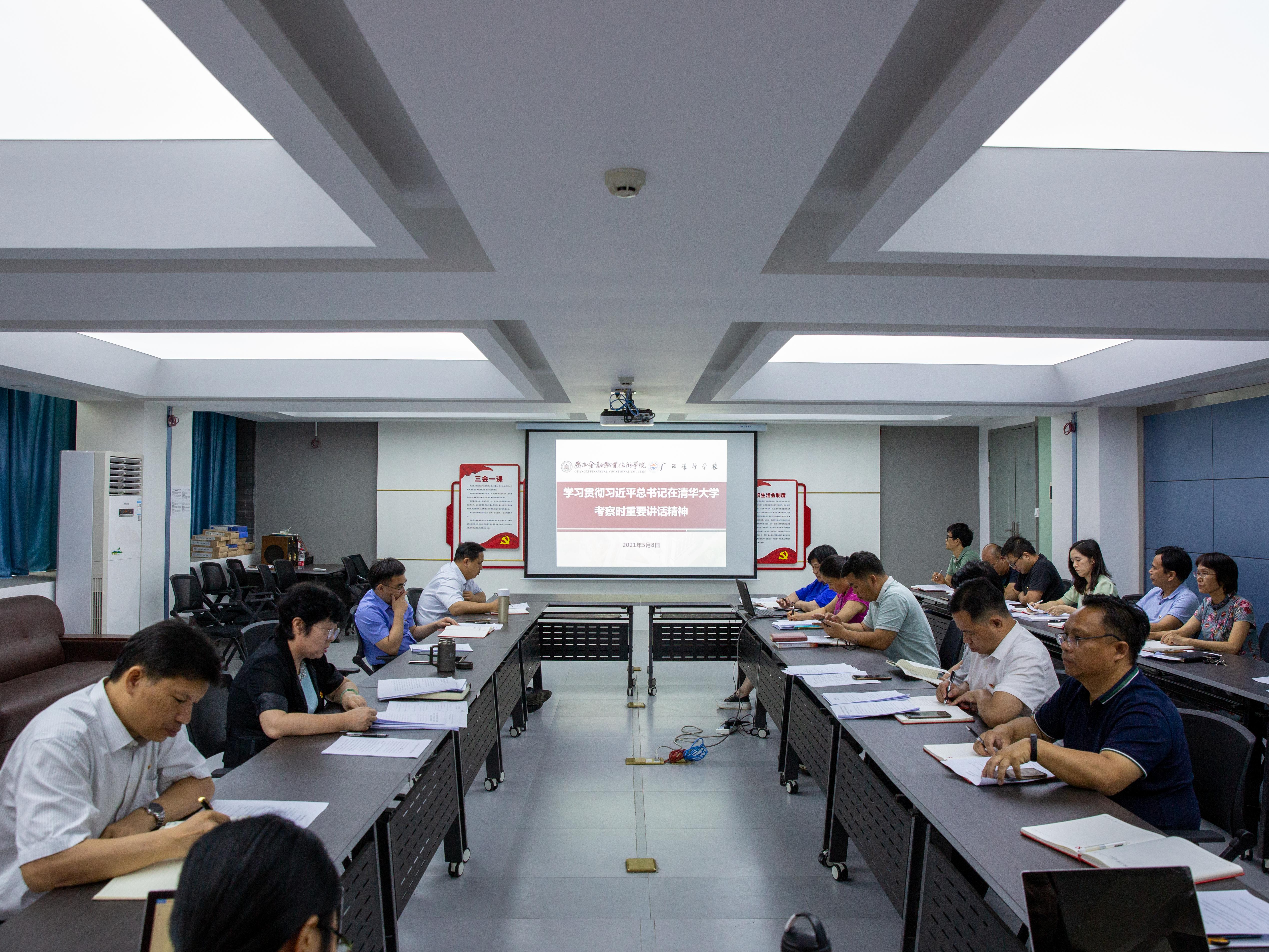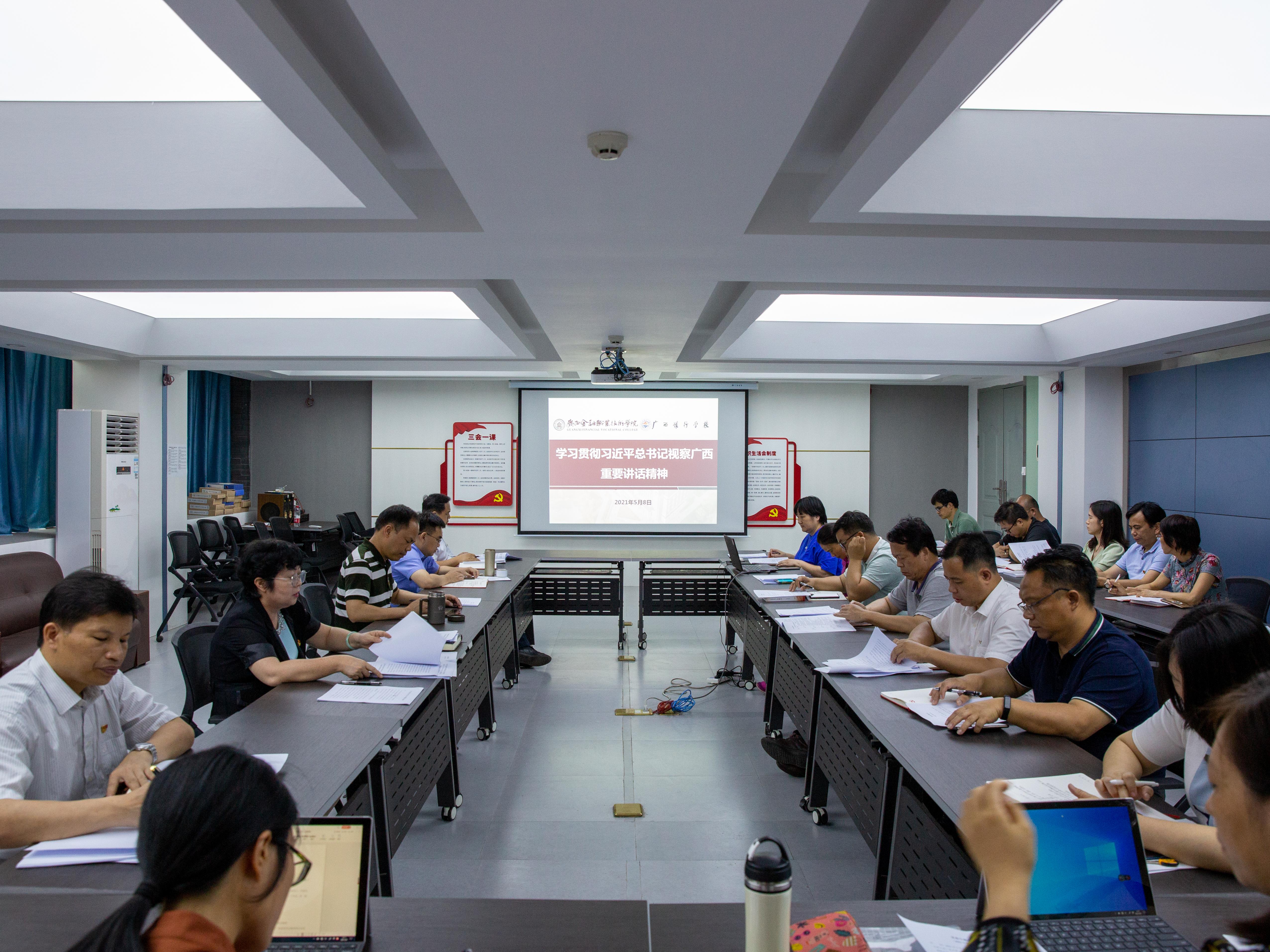 5月8日下午,学校党委召开扩大会议。集中学习习近平总书记到广西、清华大学时的重要讲话精神,传达学习自治区党委鹿心社书记在全区领导干部大会传达学习习近平总书记视察广西时的重要讲话和重要指示精神和自治区党委教育工委、教育厅刘友谊书记在召开教育厅党组扩大会传达学习习近平总书记视察广西时的重要讲话和重要指示精神。学校党委书记沈立君主持学习会。