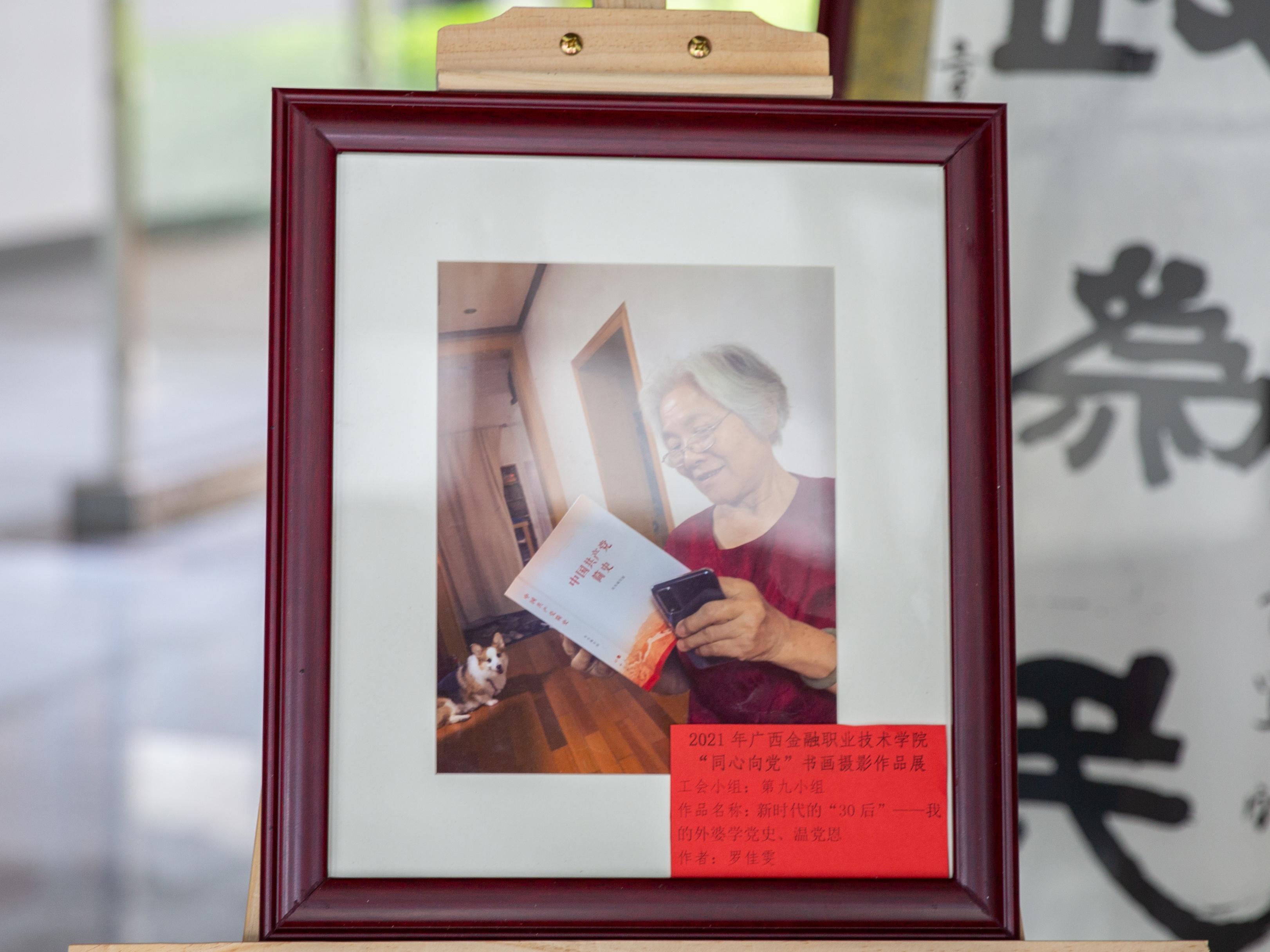 本次展览共展出21幅书法、绘画和摄影作品。评选出一等奖1名、二等奖3名,三等奖6名,优秀奖11名。其中王建国老师的书法作品《习近平在党史学习教育动员会上的讲话》、《求客观、务执政对联》分获一等奖、二等奖,禹志远老师的绘画作品《壮乡新貌》、孟菁璐老师的绘画作品《走进新时代》获得二等奖。