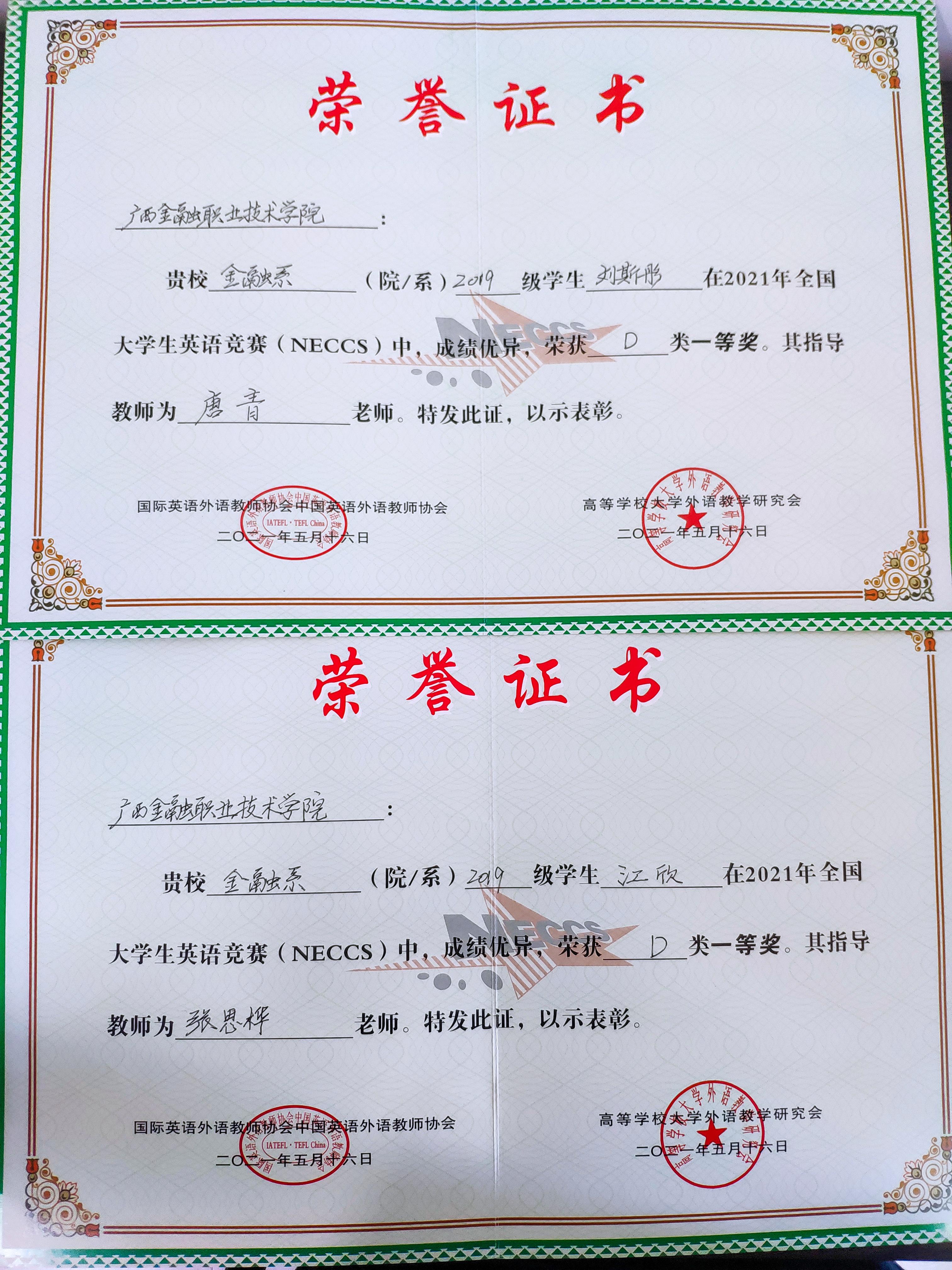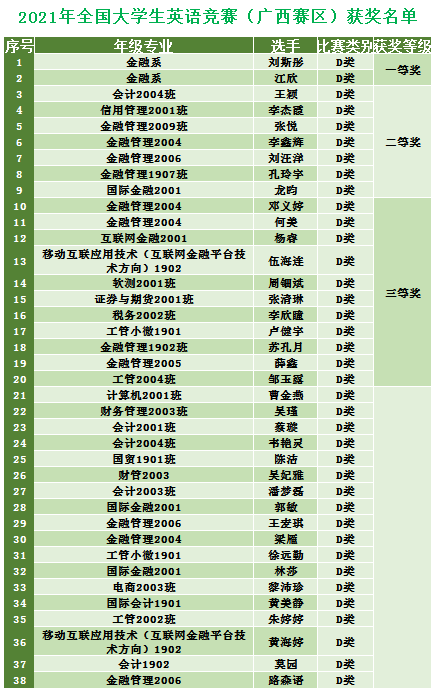 近日,全国大学生英语竞赛组委会传来喜讯,我校学子在2021年全国大学生英语竞赛中表现优异,荣获佳绩。其中,金融系刘斯彤、江欣两位同学获得了全国大学生英语竞赛广西赛区一等奖的好成绩;王颖、李杰霞等7位同学获得了广西赛区二等奖,邓义婷、何美等11位同学获得了广西赛区三等奖,曹金燕、张耀元等56位同学获得了广西赛区优胜奖。我校公共基础部教师唐青、张思桦荣获优秀指导教师奖,学校荣获优秀组织奖。