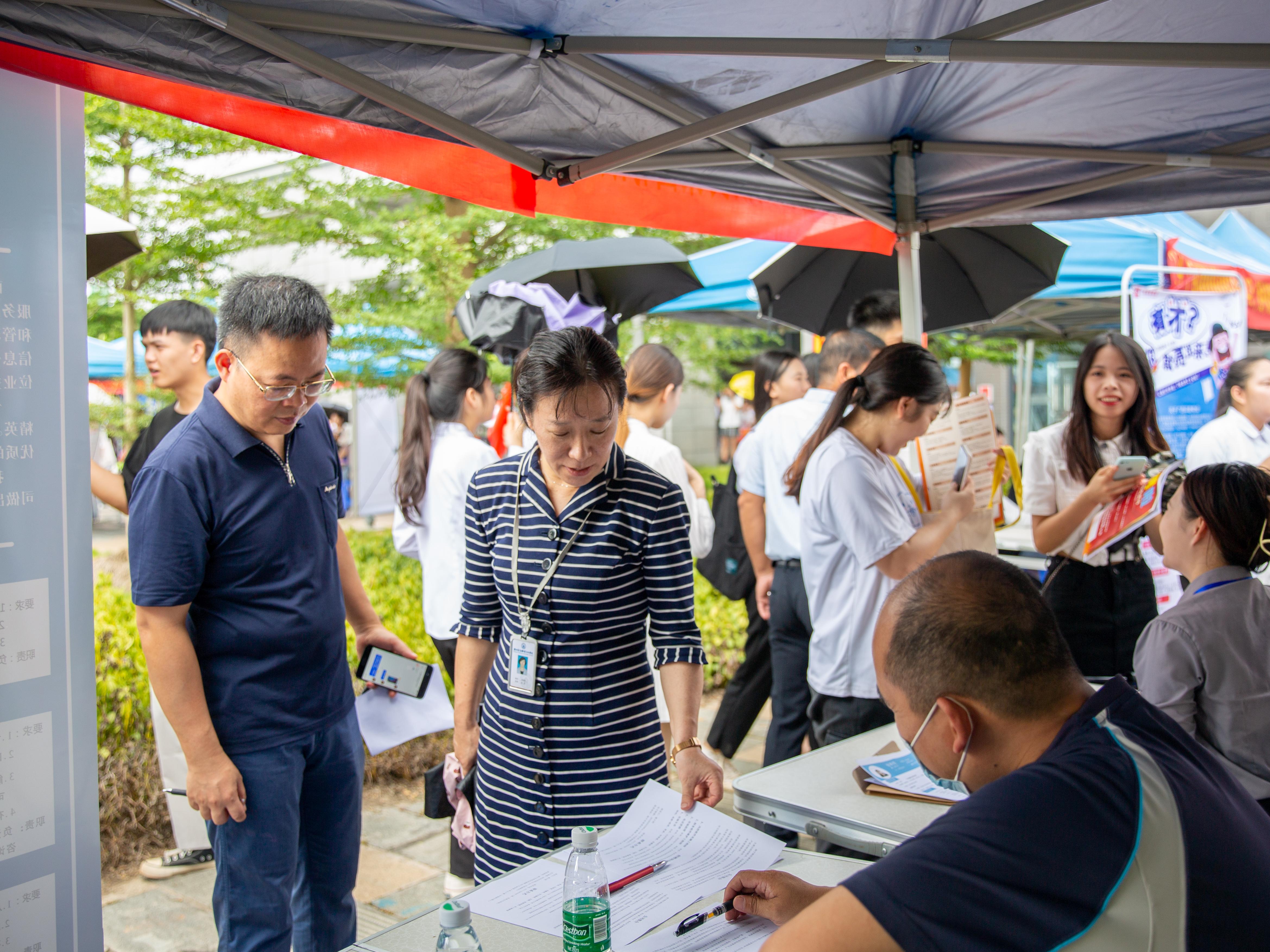 双选会上,院长莫海燕带领职能部门负责人与多家参会企业进行交流,了解用人单位人才需求以及学生应聘的情况。