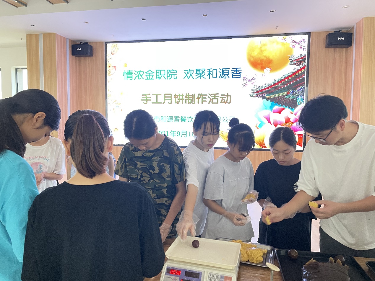 2021年9月18日,中秋节前夕,我院资助科联合南宁市和源香餐饮有限公司组织我院20级的勤工助学的30位学生开展了主题为《情浓金职院,欢聚和源香》的手工月饼制作活动。