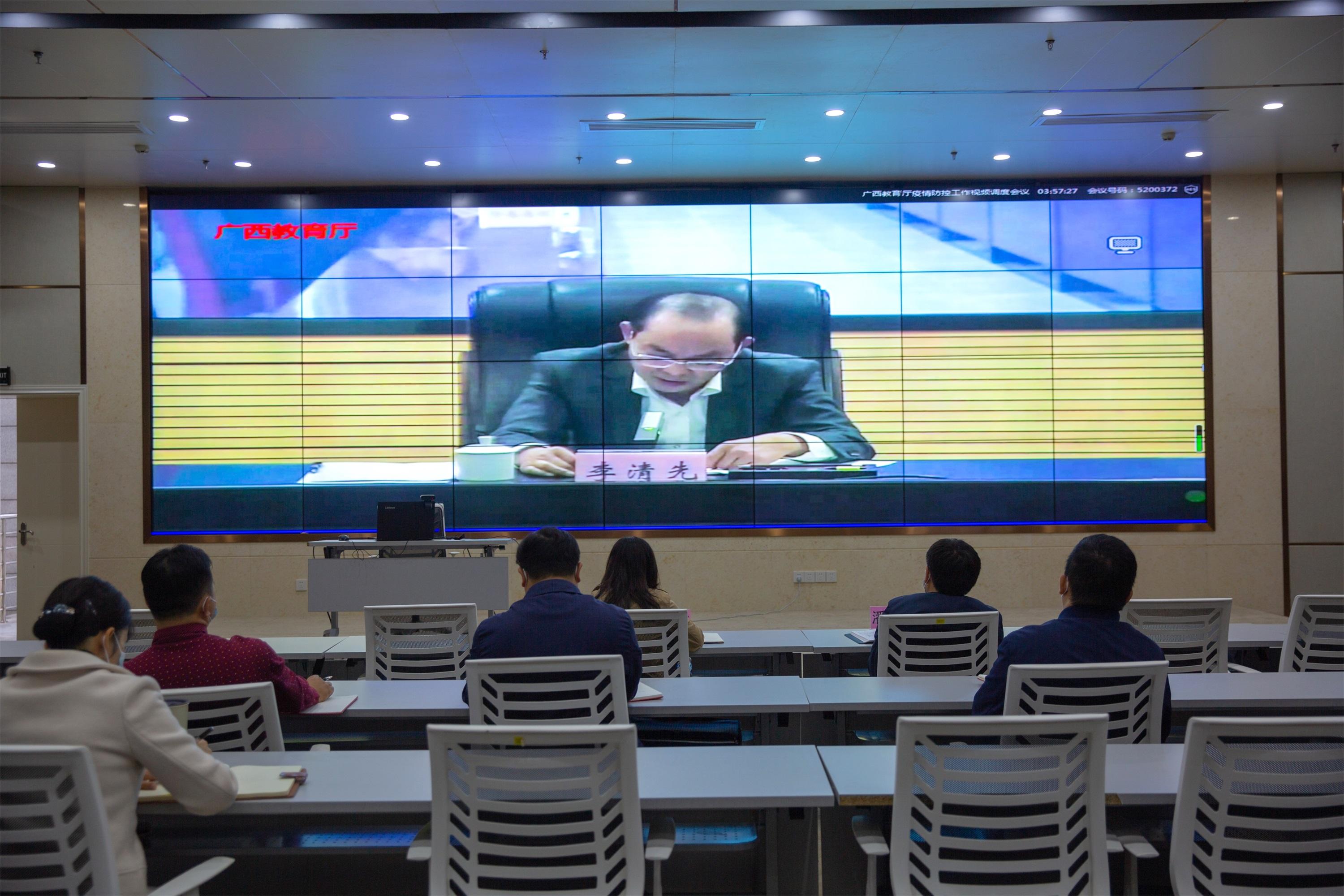 11月17日下午,自治区教育厅在南宁召开全区教育系统疫情防控工作视频调度会议,对今冬明春全区教育系统疫情防控工作进行部署。教育厅党组成员、副厅长李清先出席会议并讲话,我校党委书记沈立君代表学校作题为《五坚持五确保 实现疫防五零》的交流发言。
