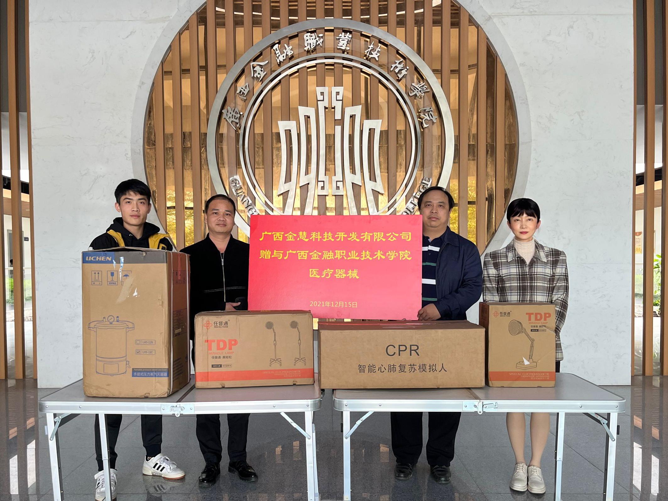 2021年12月15日,广西金慧科技开发有限公司向我校捐赠心肺复苏模拟人、电磁波治疗仪等一批医疗器械,助力学校开展急救教育、健康教育与医疗卫生工作。