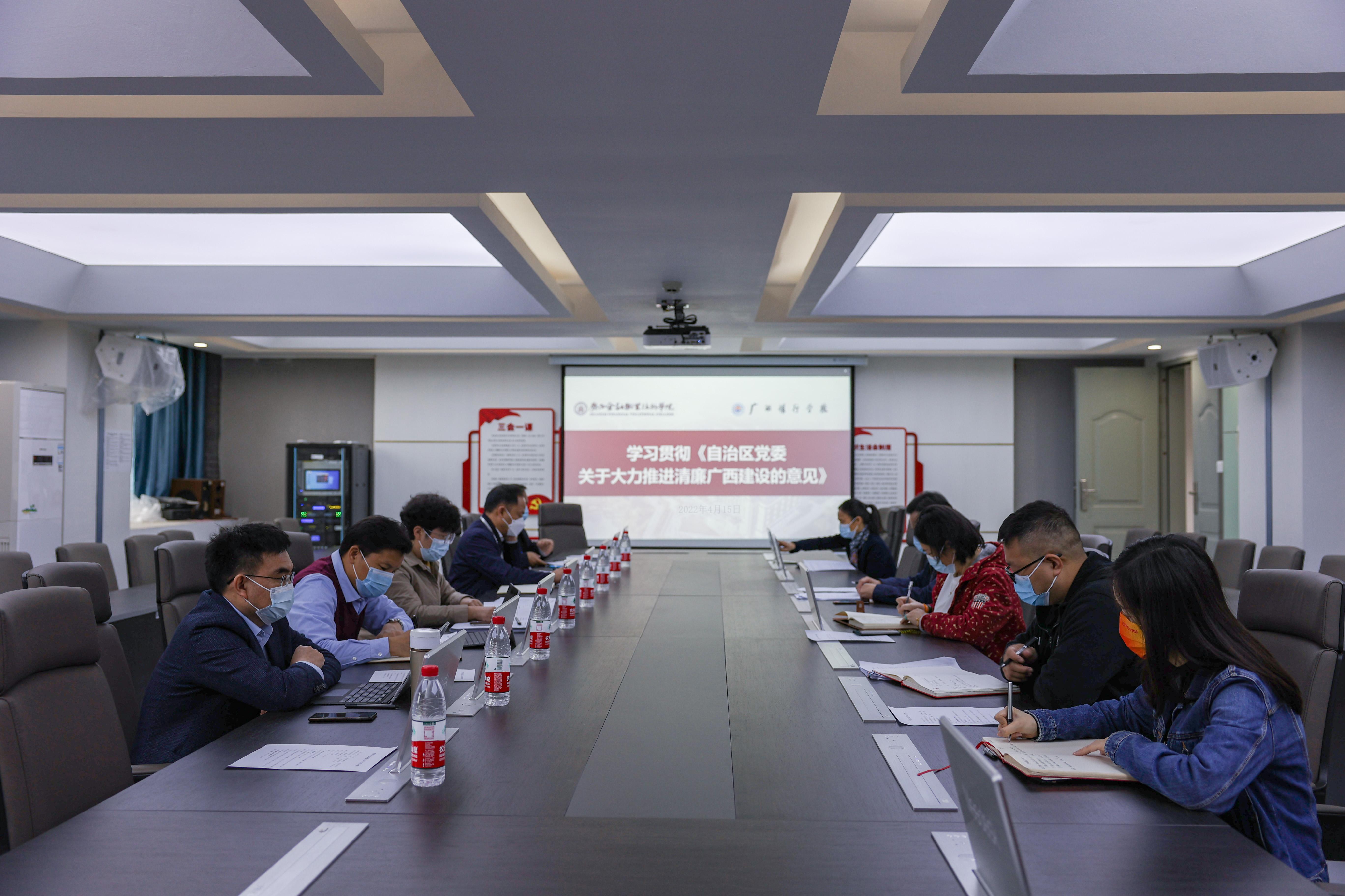 会议指出,大力推进清廉建设是以习近平同志为核心的党中央作出的重大决策部署,学校全体党员干部要提高政治站位,加深对推进清廉广西建设重要性认识。要大力推进清廉学校建设,制定工作方案,明确指导思想、总体目标、主要内容和工作要求。严格落实自治区党委关于清廉广西建设各项工作部署要求,持续加强党风廉政建设和反腐败斗争,积极采取措施,确保确保取得实实在在的成效。