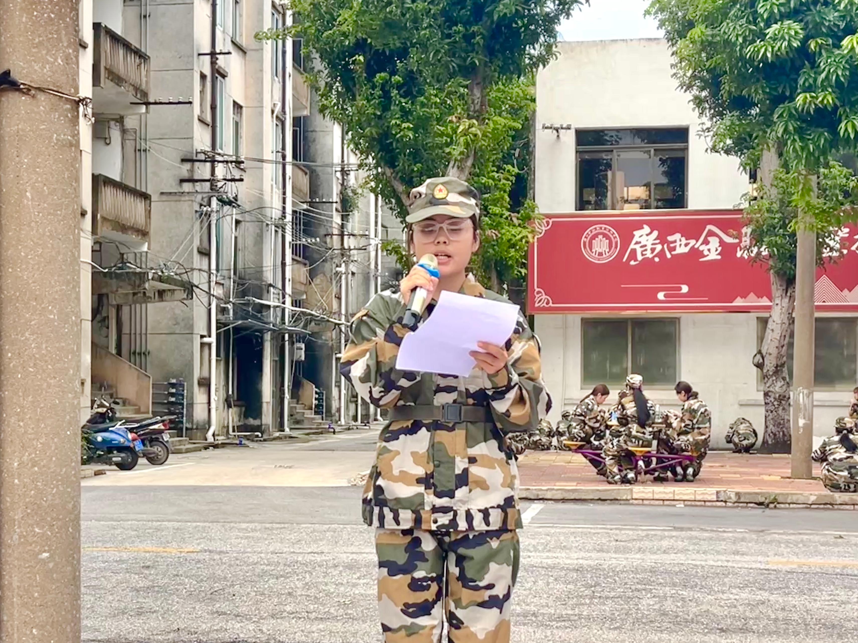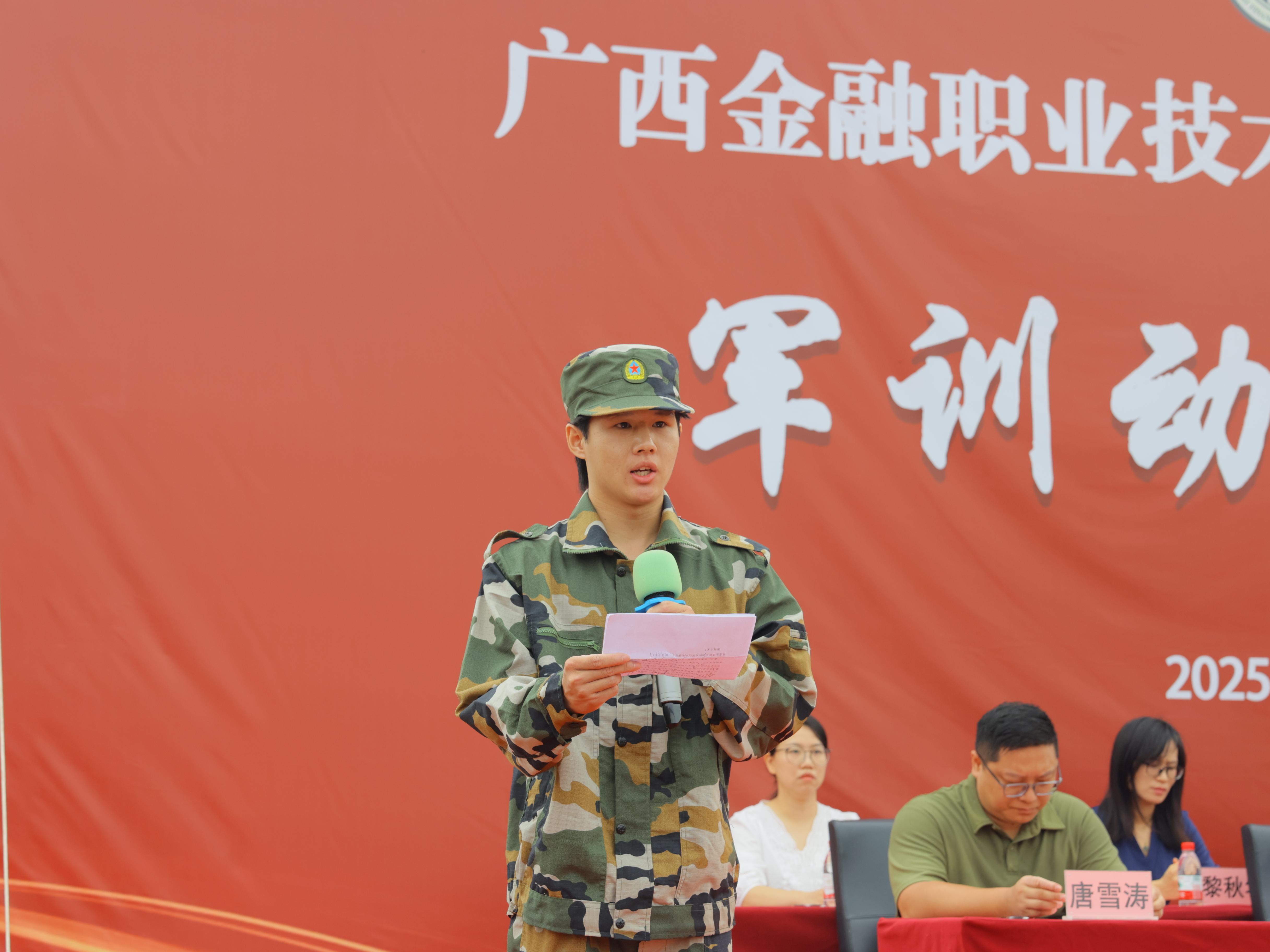 文化与旅游学院高铁乘务2502班梁娅萱同学、金融学院金融服务与管理2502班刘靖铭同学作为学生代表发言,他们表示会在烈日下挺直脊梁,展现青春的朝气;在训练中互帮互助,凝聚集体的力量;在休息时交流分享,收获珍贵的友谊。我们要把军训中的收获转化为学习的动力,在广西金融职业技术学院的沃土上,书写属于我们这一代人的青春华章。