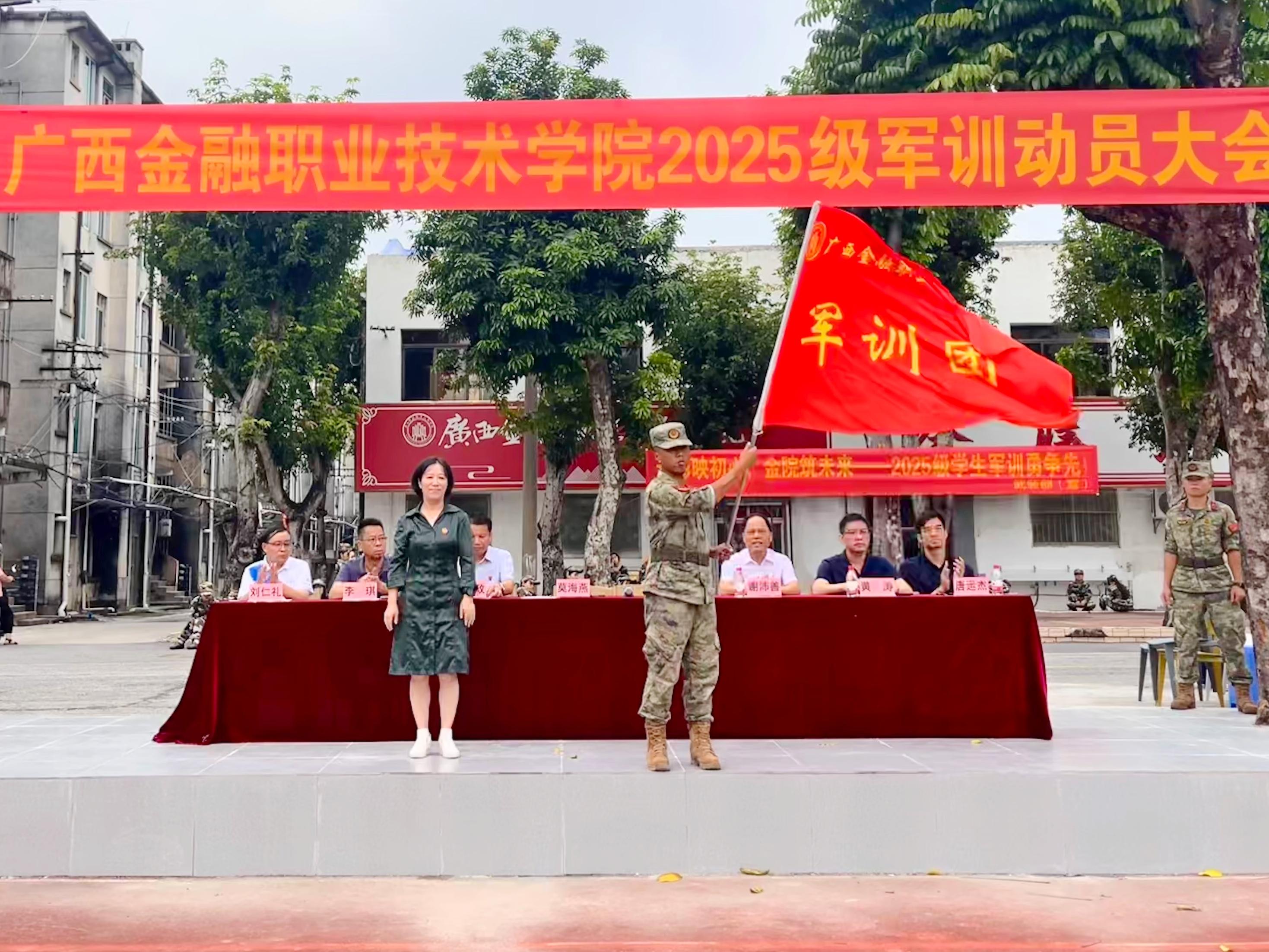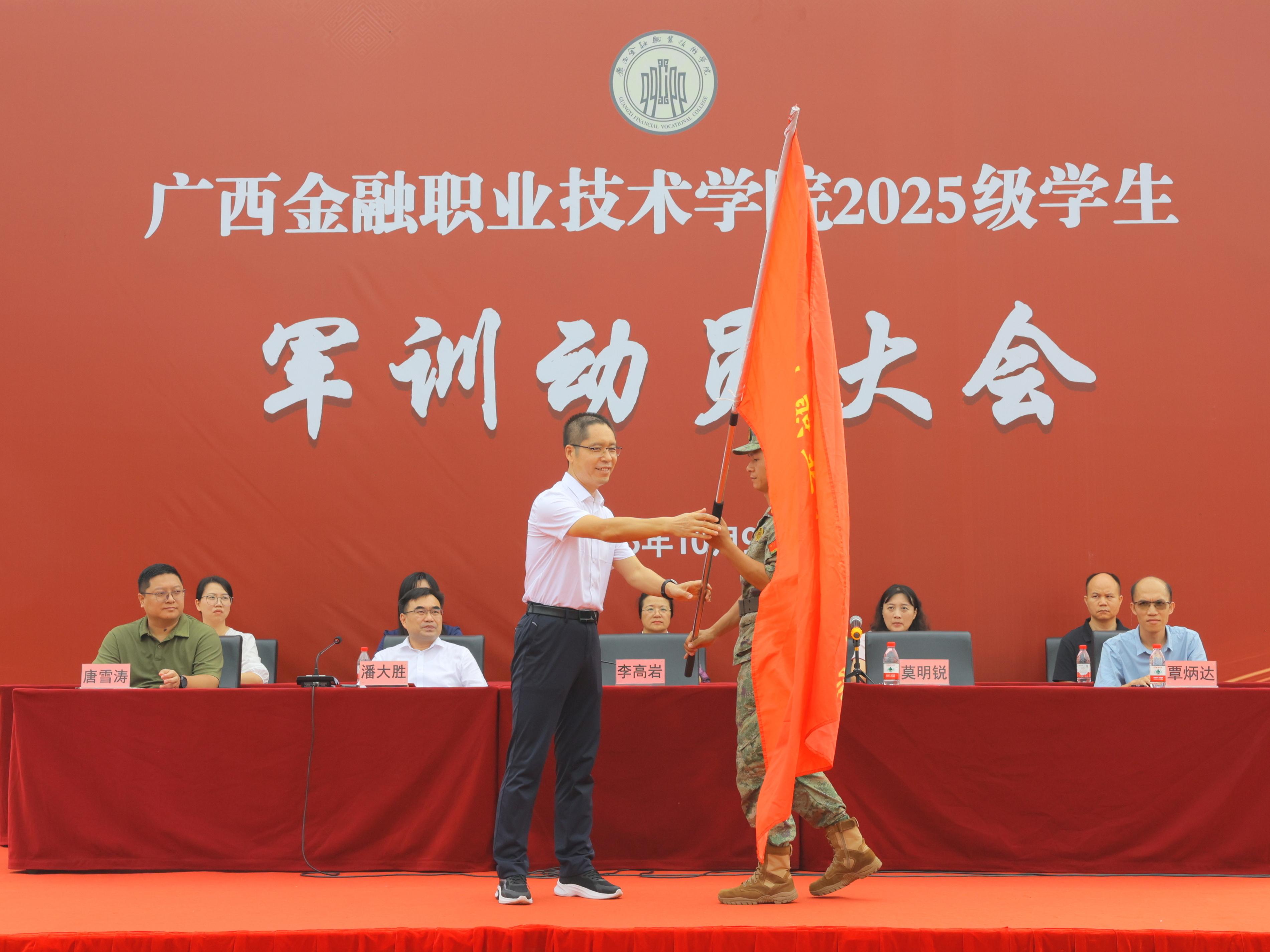 会上,李高岩书记和莫海燕校长向承训单位授军训团团旗,鲜红的旗帜高高飞扬,我校2025级学生军训正式拉开帷幕。