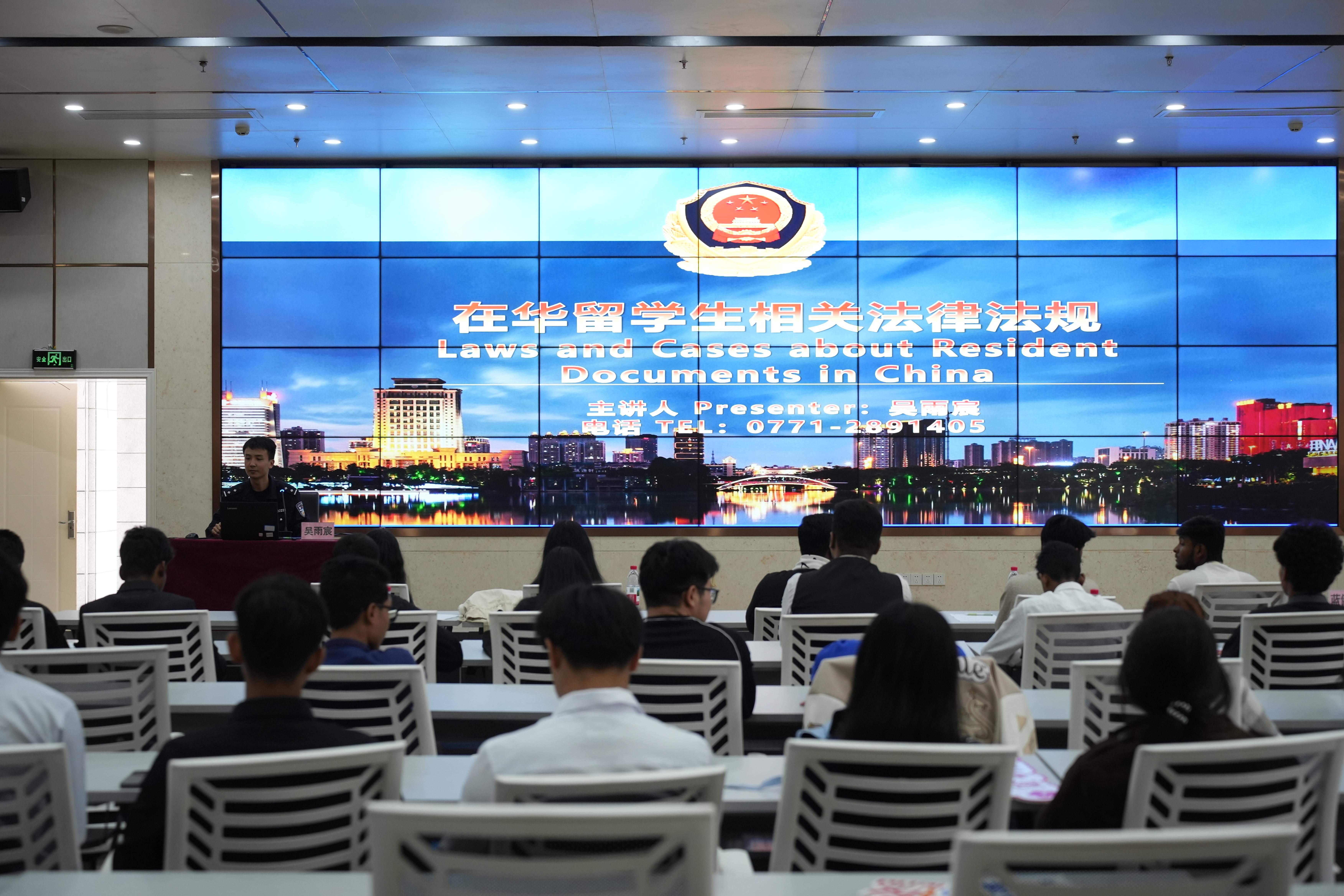 开学典礼后,2025级国际学生入学教育活动正式启动。南宁市公安局出入境管理支队民警围绕签证办理、居留许可、出入境合规等核心内容进行讲解,帮助国际学生明晰在华生活的“安全底线”;教务科研处聚焦教学管理规范,详细解读课程设置、考核标准等关键事项,引导新生快速适应学习节奏;学生工作处则从校园安全、住宿管理、活动参与等方面开展教育,为新生融入校园生活提供全面指引。