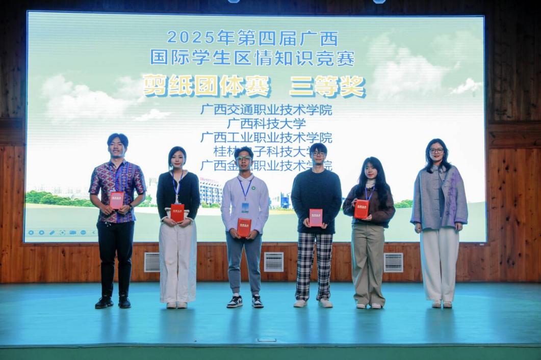 为深化国际学生对广西区情与中华文化的认知,搭建跨校交流与文化互鉴平台,第四届广西国际学生区情知识竞赛于2025年11月27日至28日在柳州城市职业学院顺利落幕。我校6名国际学生参加比赛,凭借扎实的知识储备与出色的团队协作,最终斩获个人赛、团体赛双项三等奖,展现了我校国际化教育的良好成果。其中2024级跨境电子商务专业的阮克亮同学(越南)荣获个人赛三等奖;郑吉梅(柬埔寨)、阮富荣(越南)、陈千丽(柬埔寨)三位同学则在剪纸团体赛中获得三等奖。