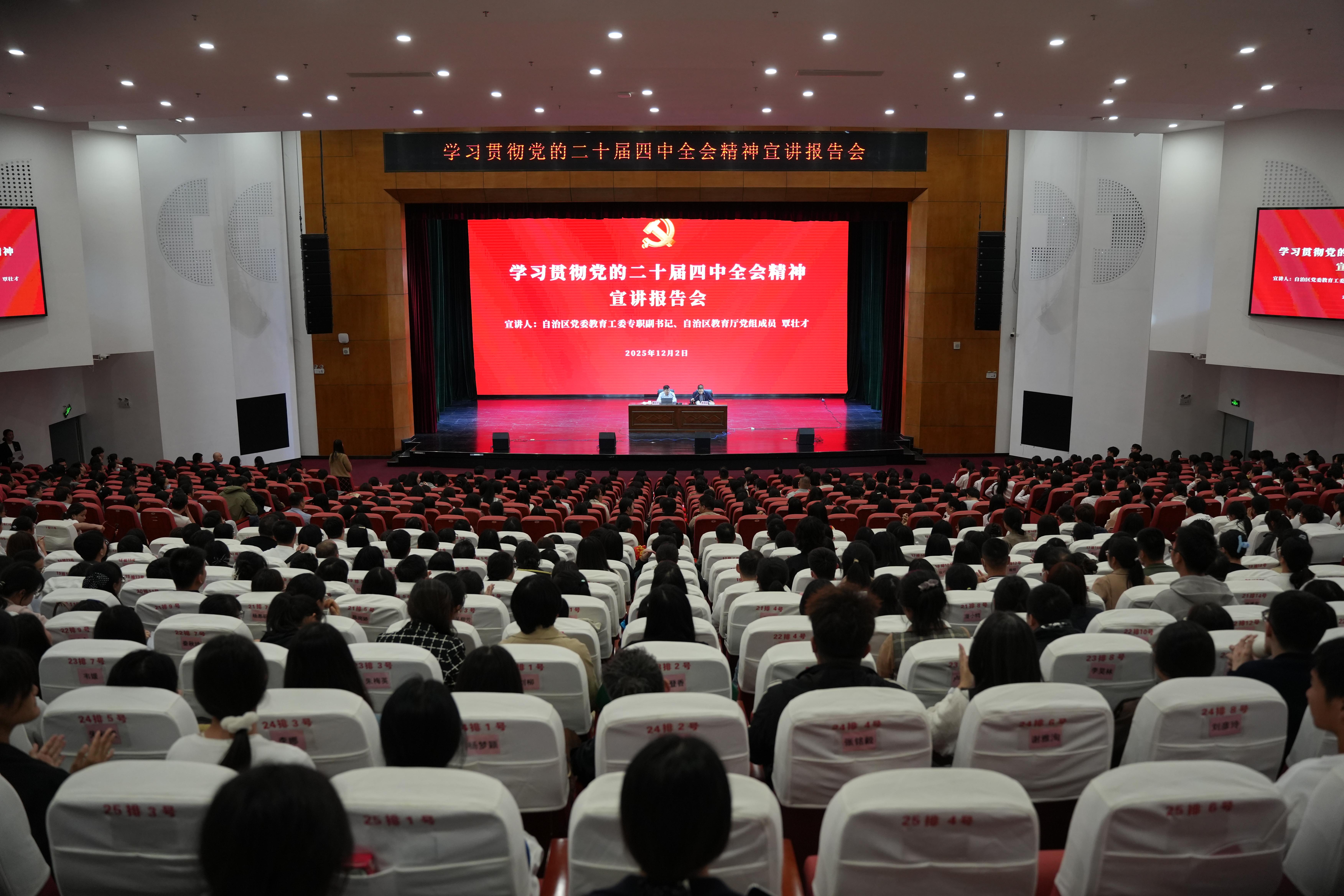 近日,我校学习贯彻党的二十届四中全会精神宣讲报告会在西校区国际会议中心举行。自治区党委教育工委专职副书记、自治区教育厅党组成员覃壮才同志作宣讲报告。校党委书记李高岩主持。