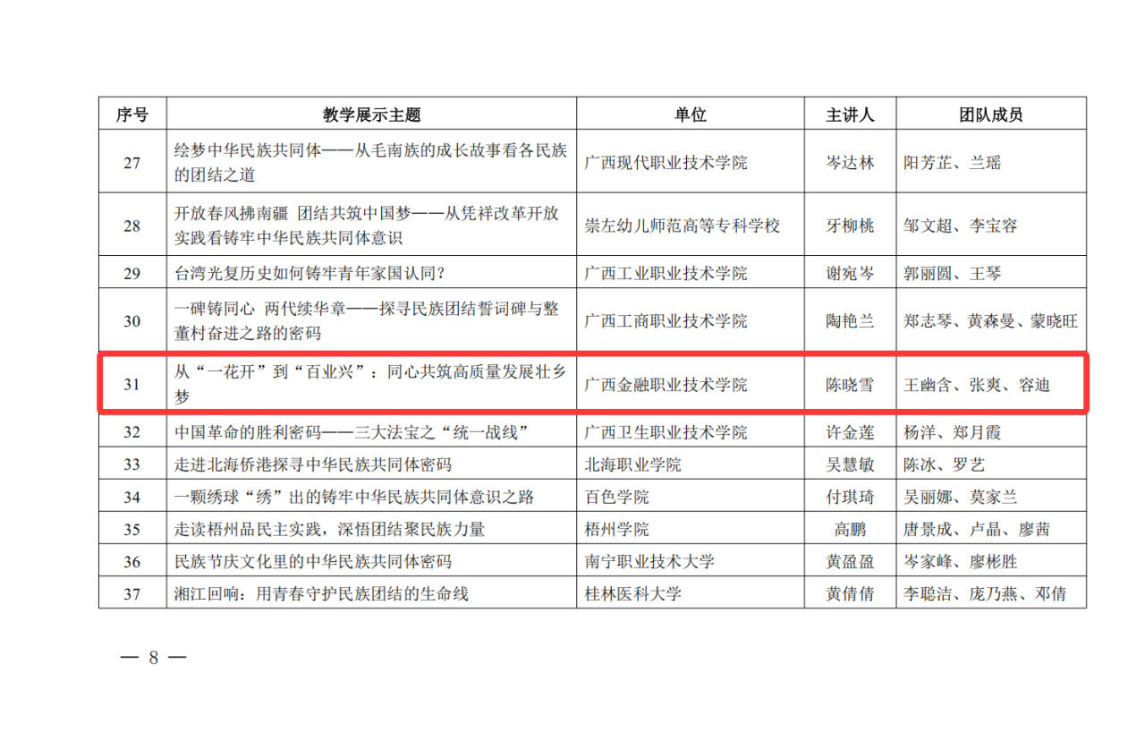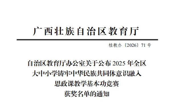 近日,由自治区教育厅主办的2025年全区大中小学铸牢中华民族共同体意识融入思政课教学基本功竞赛正式公布获奖名单。我校由陈晓雪、王幽含、张爽、容迪四位教师组成的团队凭借《从“一花开”到“百业兴”:同心共筑高质量发展壮乡梦》教学展示荣获高校组三等奖。