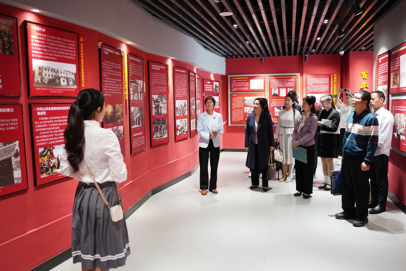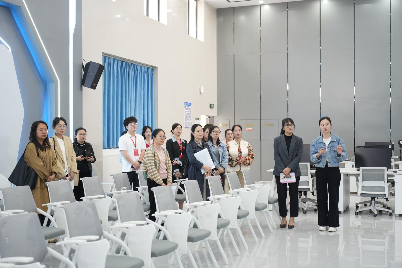 会后,与会领导和教师代表们共同参观了我校百年党史、百年红色金融史教育基地以及中小学生研学实践教育基地——数字贸易学院(工商管理学院)虚拟仿真实训室,大家认真聆听讲解、观摩数字实操,在红色长廊中感悟红色金融的发展历程与初心使命,在研学实践基地中体验AI技术为思政教育带来的全新变革。