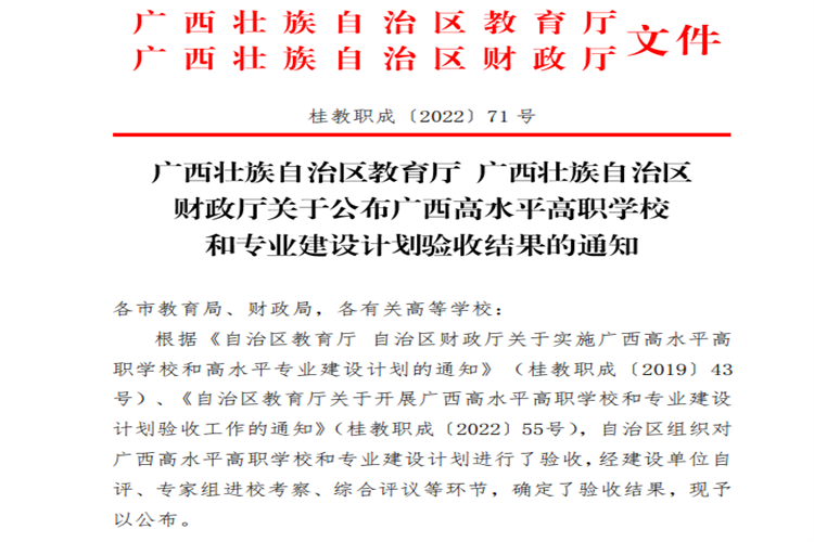 2022年12月28日,自治区教育厅发布公示,我校顺利通过广西高水平高职专业建设验收,我校经过培育建设,会计高水平培育建设取得了明显成效,会计系双高建设标志性成果如下: