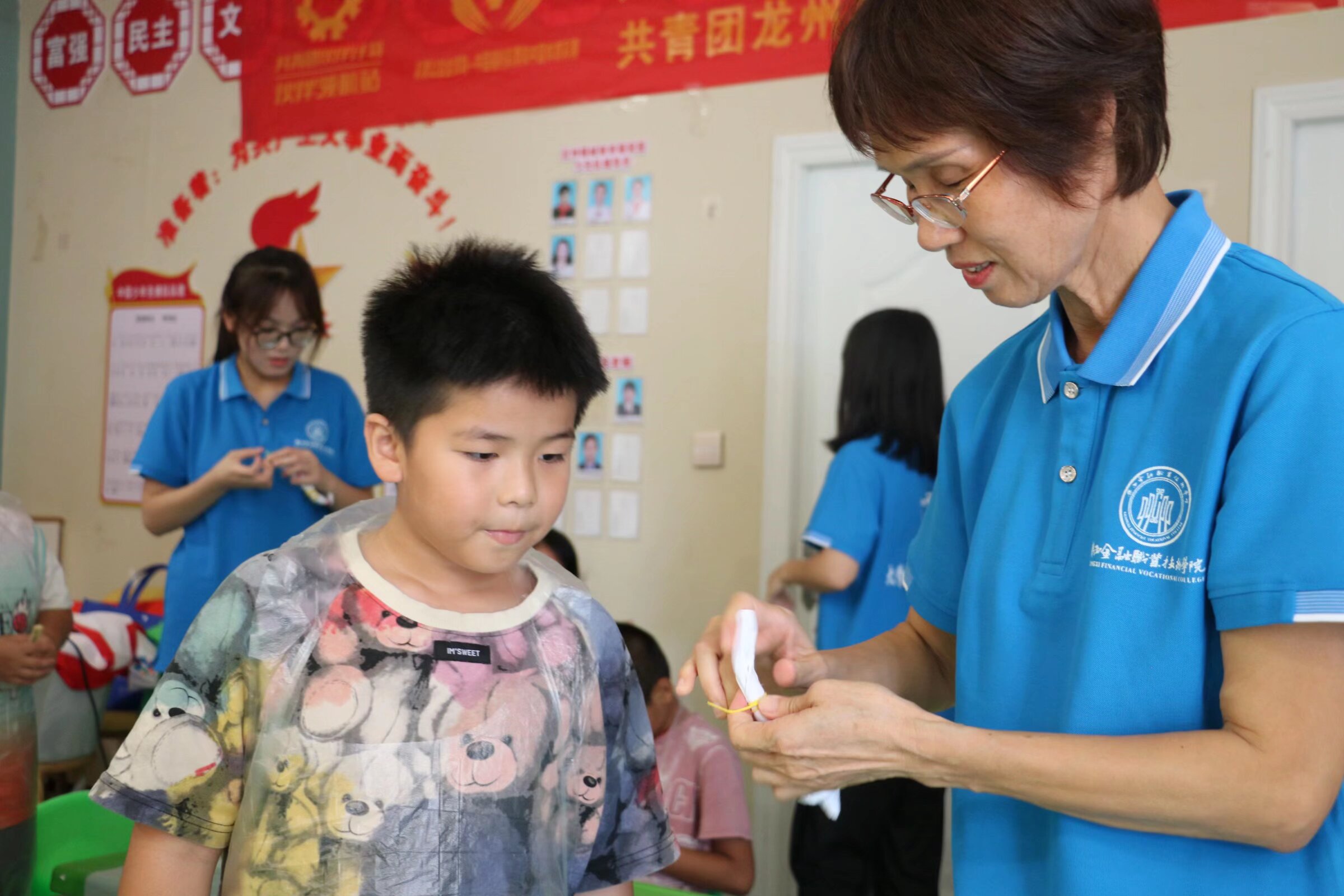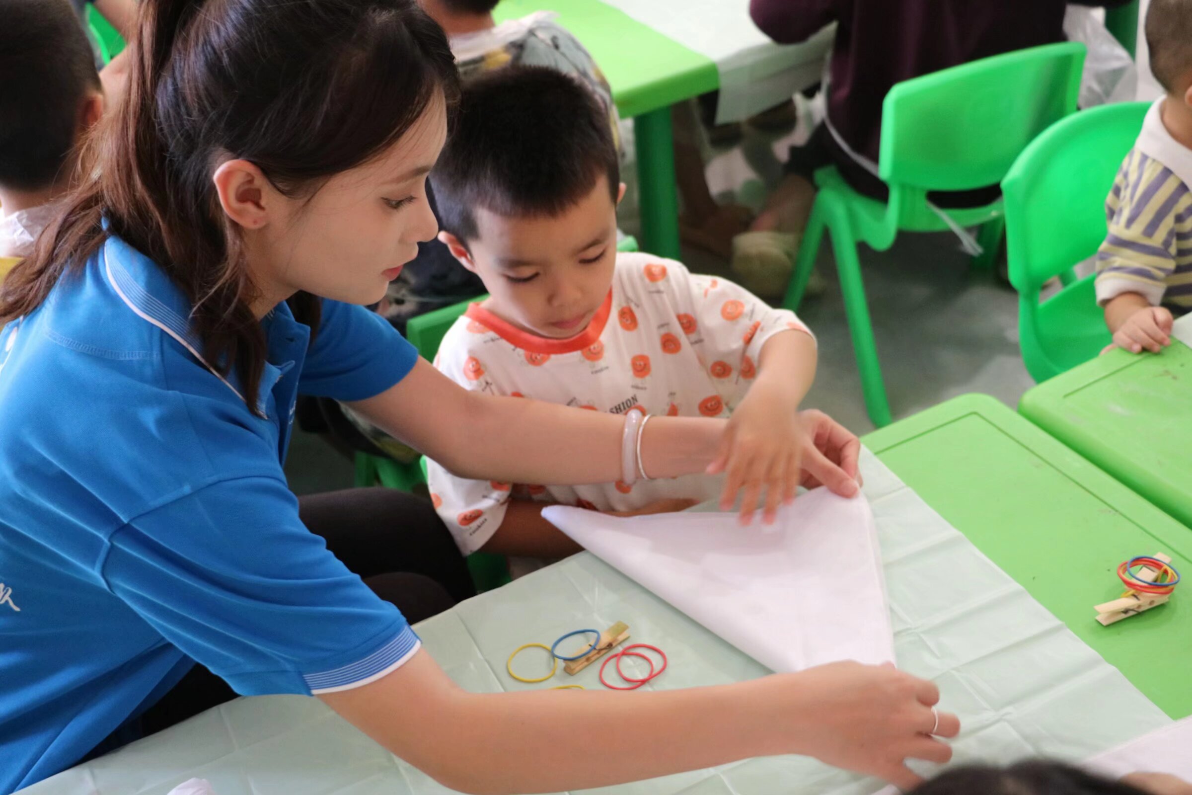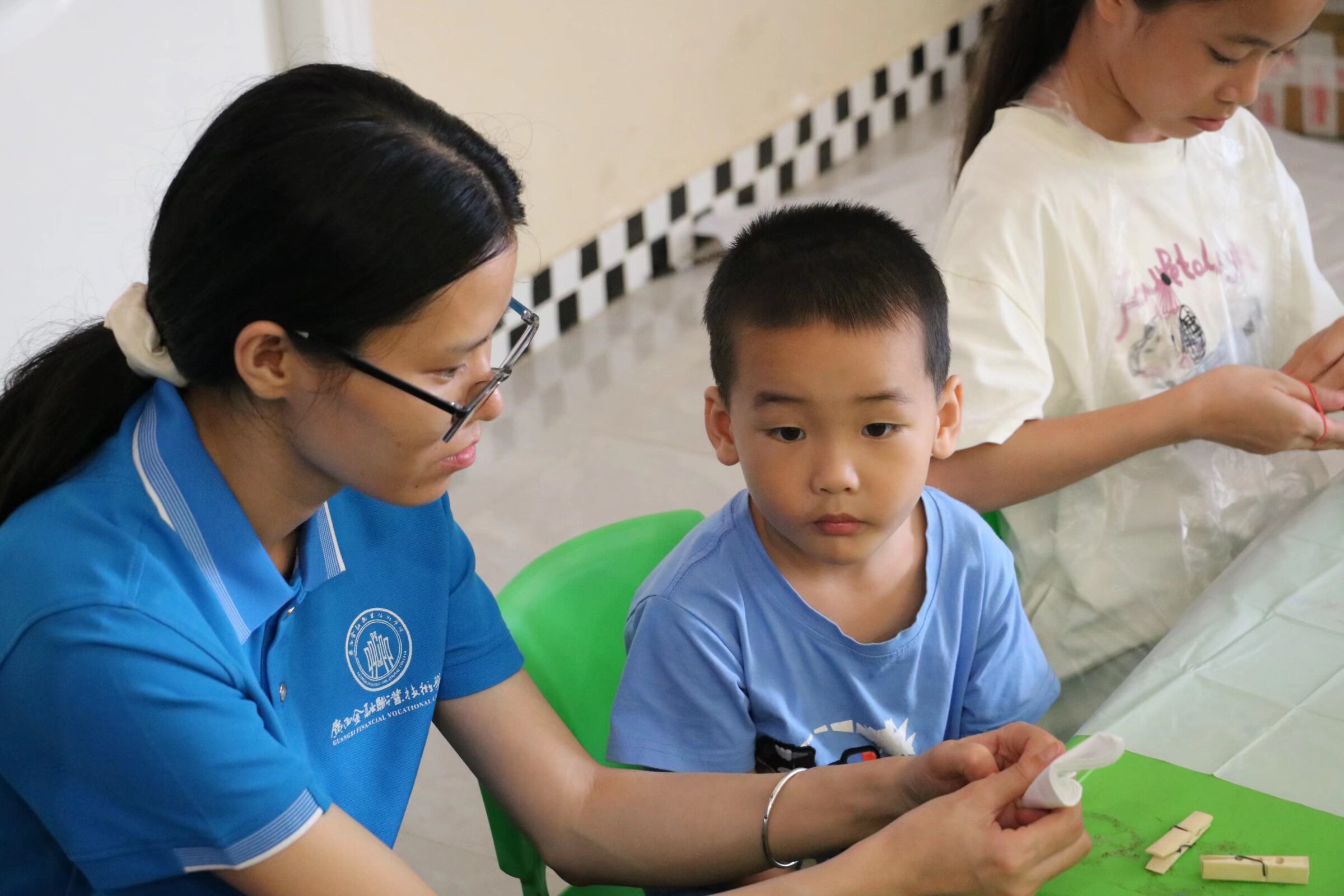 活动伊始,社会实践服务队成员精心筹备,以援藏青年杰出代表俞秀松的先进事迹为切入点,向小朋友们生动讲述其在艰苦环境下无私奉献、心系国家的高尚情怀与不凡历程,为孩子们树立起崇高的人生榜样,引导他们树立正确的价值观与人生观,激励他们传承先辈精神,在成长道路上勇担重任。随后,团队成员深入浅出地讲解扎染这门古老而富有魅力的非遗技艺,从其深厚的历史渊源徐徐展开,追溯至扎染艺术在我国传统文化长河中的起源与发展脉络,深入剖析其蕴含的文化内涵与民族精神,生动展示了这一技艺在不同历史时期所承载的独特艺术价值与社会意义。在讲解扎染技法精髓环节,成员们细致入微地演示了从布料的精细折叠、巧妙捆扎,到染色、均匀晾晒等一整套复杂而精细的工艺流程,层层剖析,抽丝剥茧,让小朋友们在沉浸式学习中充分领略传统扎染工艺巧夺天工的独特魅力,感受先辈们智慧的结晶与匠心的传承,激发起他们对传统文化的浓厚兴趣与无限向往,为后续实践操作筑牢理论根基。