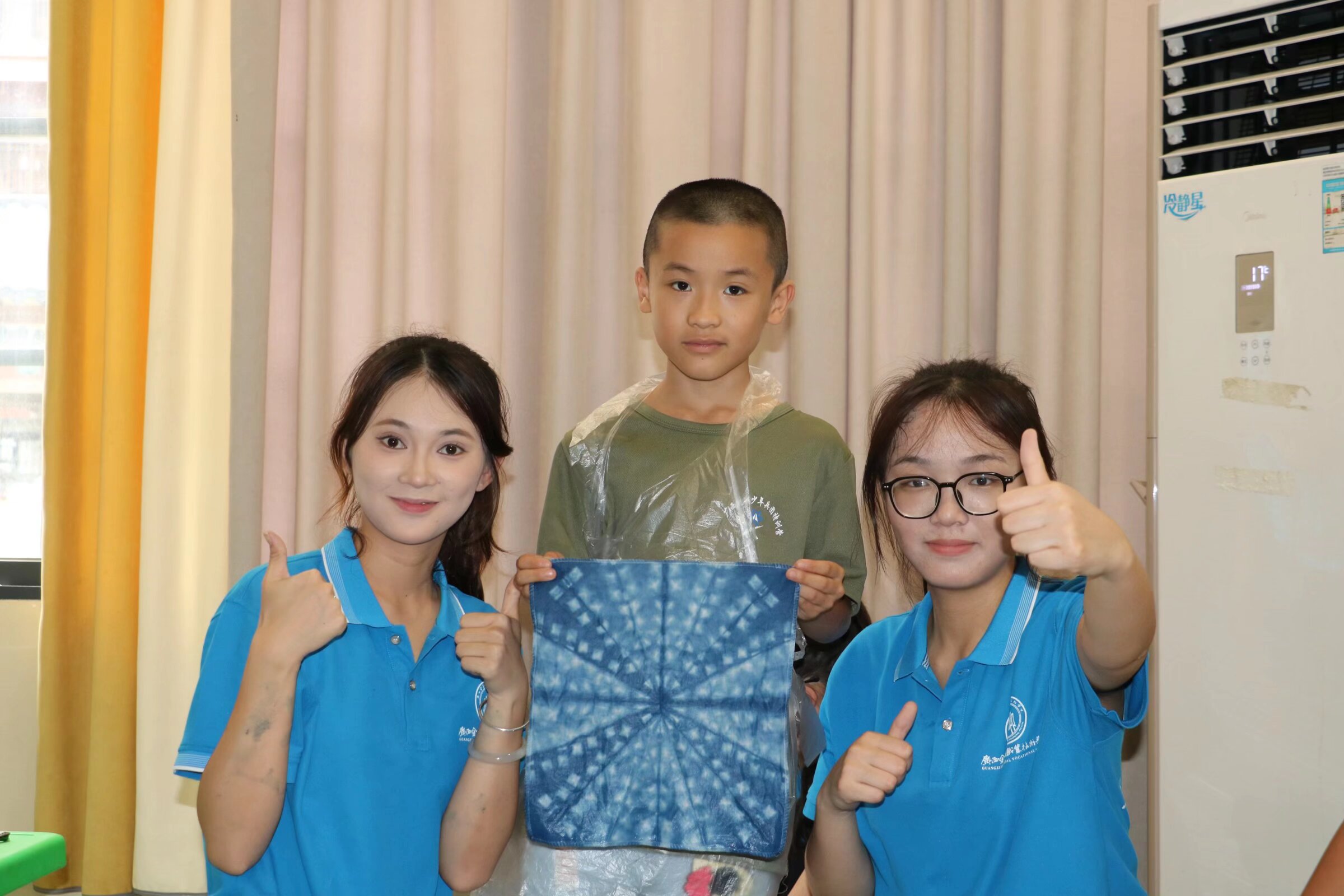 进入实操阶段,团队成员与青年驿站的小朋友们热情互动、携手共进,共同开启了一场别开生面、充满创意与乐趣的手工扎染之旅。孩子们化身小小艺术家,充分发挥天马行空的想象力,运用灵活的小手,将素白棉布通过折叠、捆绑、缠绕、夹固等手法巧妙塑形,精心设计出独一无二的造型样式。随后,孩子们将塑形后的棉布投入天然植物染料中,亲眼目睹布料在浸泡、氧化过程中发生的奇妙色彩变化,亲身体验传统扎染技艺的神奇魅力。经过固色、清洗、拆解等一系列严谨工序,原本朴素的布料在孩子们的巧手下华丽转身,蜕变为一幅幅蓝白交织、独具匠心的艺术品让小朋友们沉浸在创作乐趣之中,不时发出对传统技艺神奇魅力的由衷赞叹,欢声笑语回荡在实践场馆的每一个角落,展现出非遗技艺在传承中焕发出的蓬勃活力与无限生机。