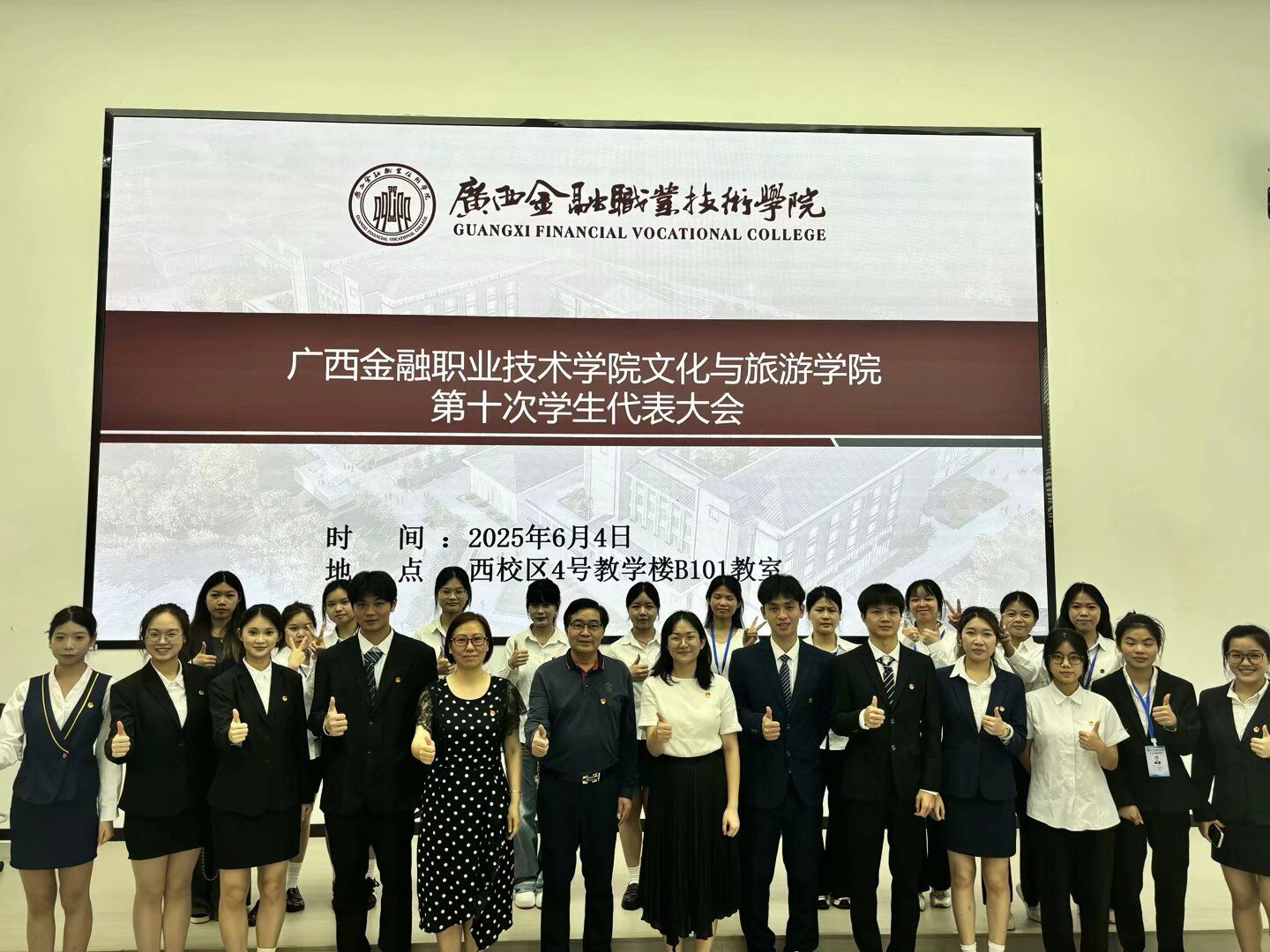 2025年6月4日下午,广西金融职业技术学院文化与旅游学院第十次学生代表大会在西校区四号教学楼隆重举行。文化与旅游学院党总支书记、院长刘仁礼,文化与旅游学院党总支副书记陆萍,文化与旅游学院分团委负责人毛小东以及主席团候选人、常任代表候选人、全体学生代表和第九届分团委、学生会骨干共近70人出席活动。