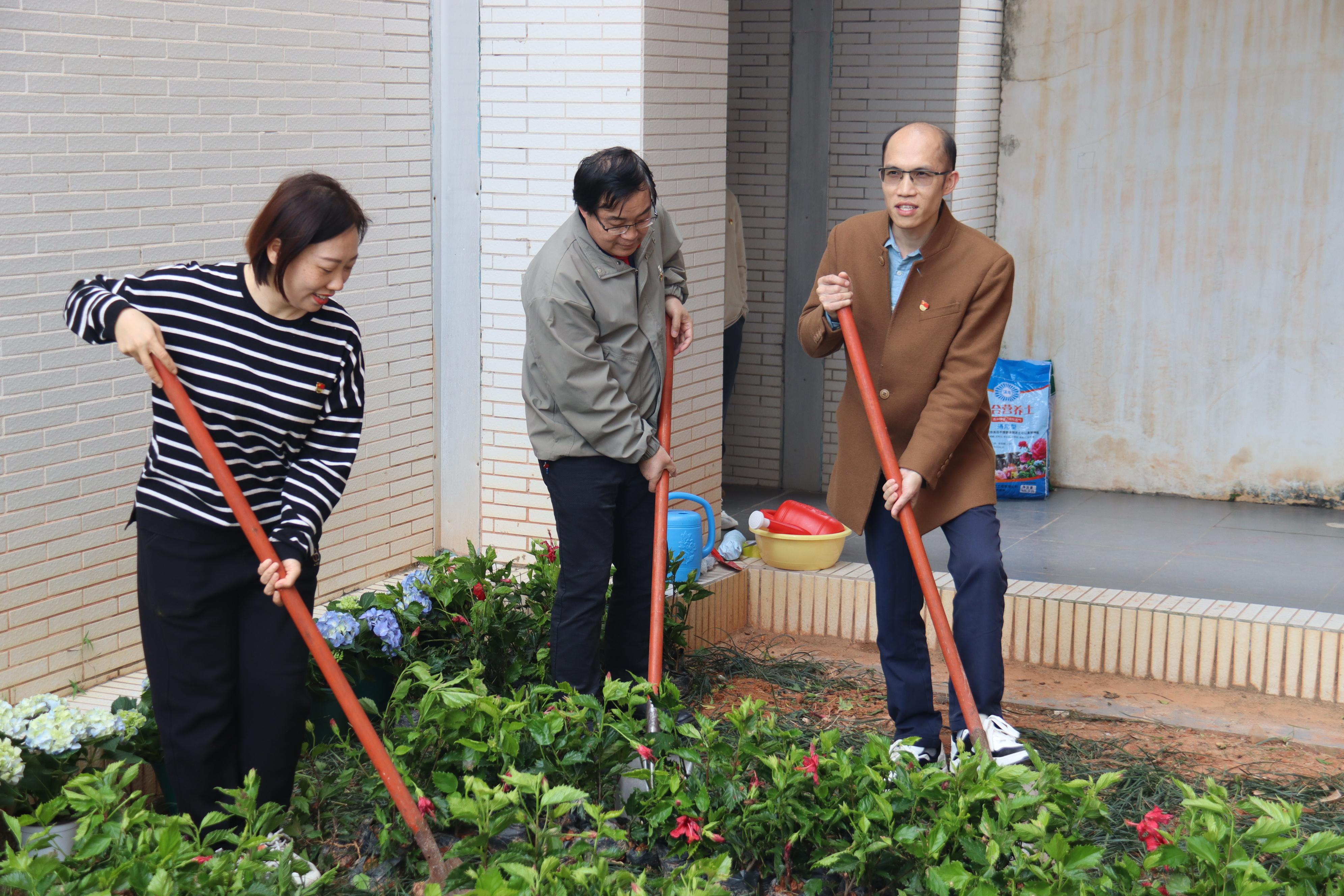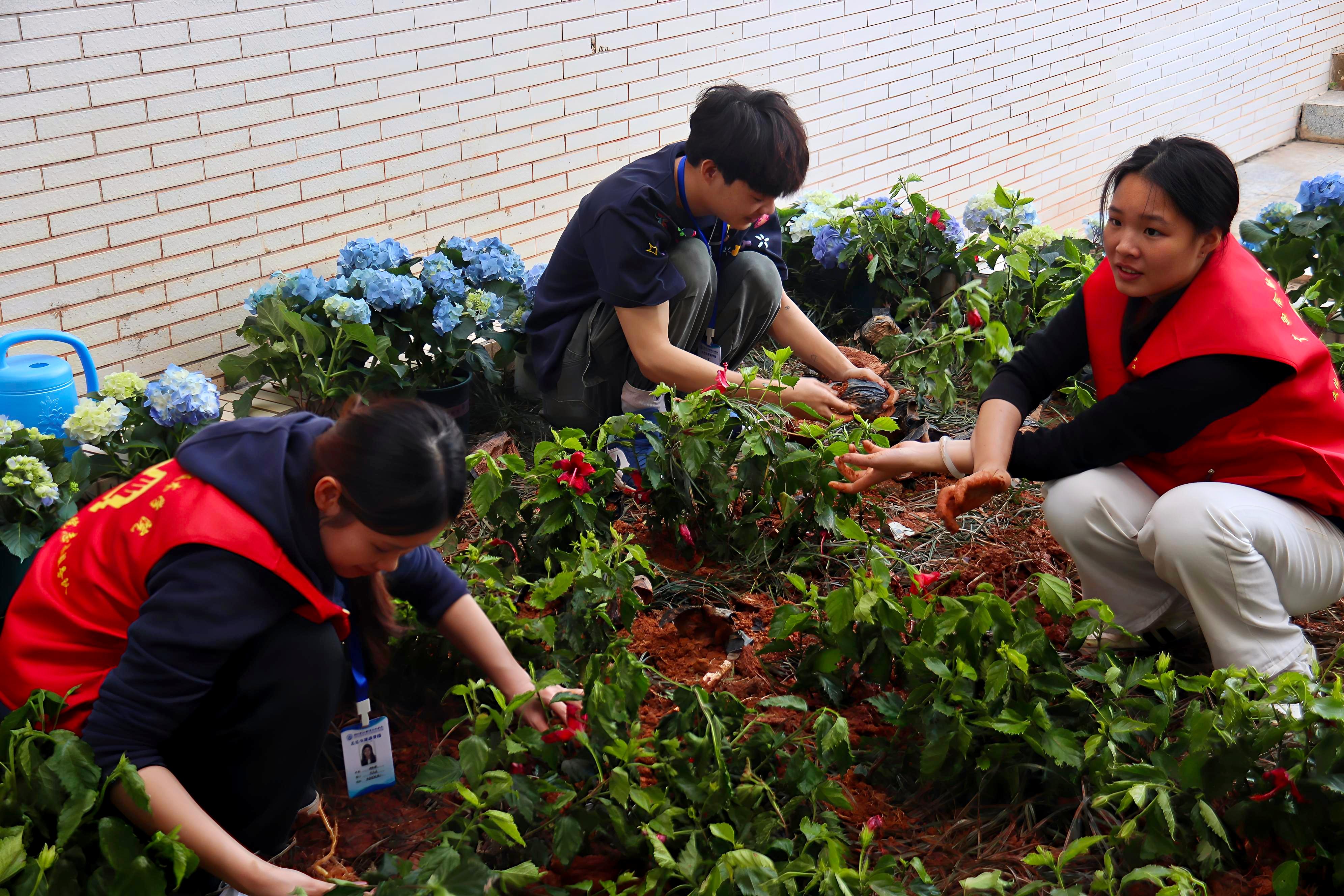 活动现场设置了“植梦芳华”主题春日打卡墙,绿植鲜花错落布置,成为校园里一道亮丽的风景线,师生们纷纷驻足拍照,定格春日美好瞬间,在温馨的氛围中感受学院对女生的暖心关怀。在绿植手工坊环节,师生们齐聚西校区2号教学楼2B108办公室旁花圃,以朱槿花、绣球花为素材,精心拼栽成“德”字造型。这一创意布置既美化了校园环境,又巧妙融入了“立德树人”“崇德尚人”的育人理念,以花为媒,以景育人,展现了文化与旅游学院将思政教育融入实践活动的创新探索。