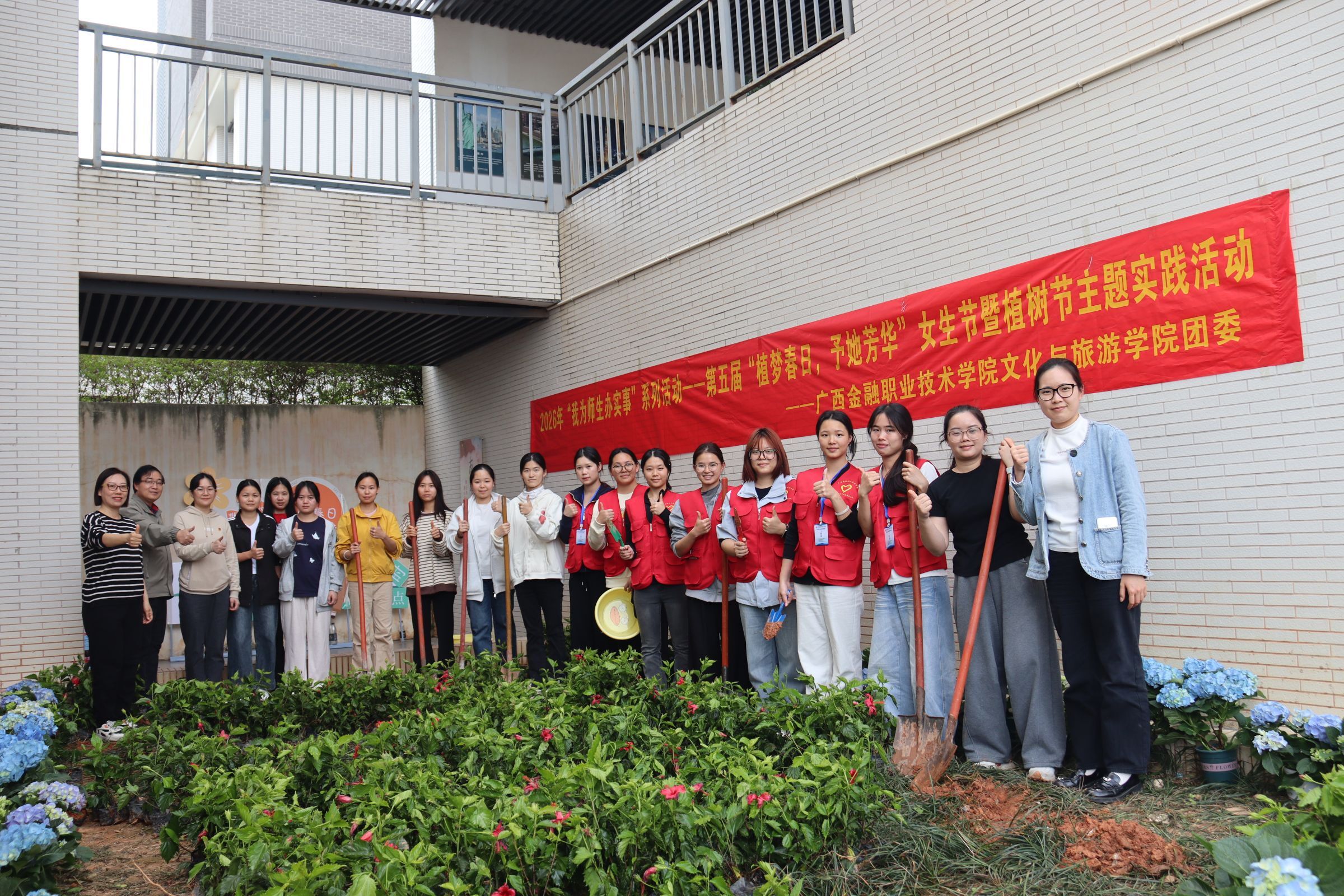 为营造关心关爱女生的校园氛围,传递绿色环保理念,深入践行和弘扬雷锋精神,2026年3月12日,文化与旅游学院第五届“植梦春日,予她芳华”女生节暨植树节主题实践活动在西校区顺利开展。广西金融职业技术学院纪委书记覃炳达,文化与旅游学院党总支书记、院长刘仁礼,党总支副书记陆萍,副院长林莉萍,文化与旅游学院部分党员教师及学生参加此次活动。