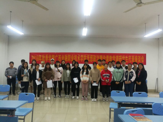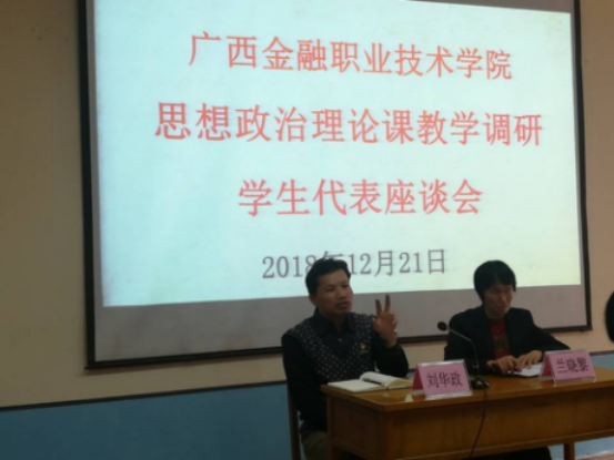 本次座谈会由广西金融职业技术学院社科部主任兰晓黎主持,学院党委副书记、纪委书记刘华政出席了会议。2018级各班代表到场参会,会议就学生所在班级对思政理论课的态度、对思政理论课的评价以及对思政课、思政教师的意见和建议进行了交流、沟通。