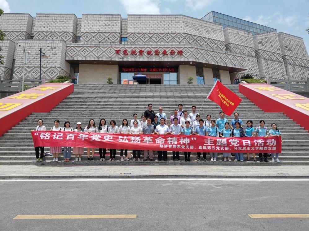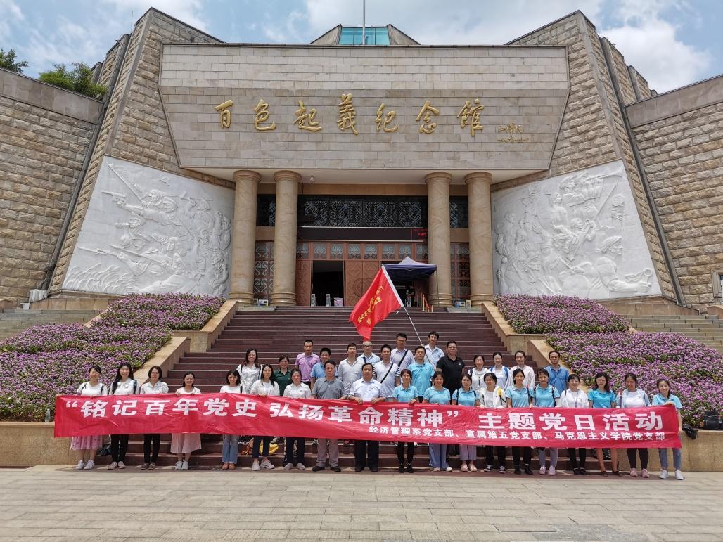 为了强化党史学习教育,加强党性教育,弘扬革命精神,5月30日,马克思主义党支部、经管系党支部、直属第五党支部组织全体党员共44人赴百色开展“铭记百年党史•弘扬革命精神”主题党日活动。