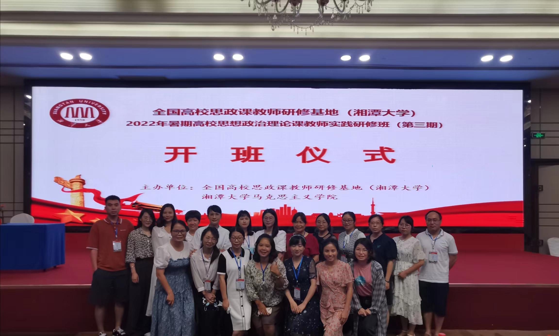 为了深入学习贯彻习近平新时代中国特色社会主义思想,贯彻落实习近平总书记在学校思想政治理论课教师座谈会上的讲话精神,提升部门思政课教师政治素质、业务能力和育人水平,增强思政课的思想性、理论性和针对性。2022年8月2日-8日,马克思主义学院组织部门教师前往湖南参加全国高校思政课教师研修基地(湘潭大学)2022年暑期高校思想政治理论课教师实践研修班(第四期)培训。