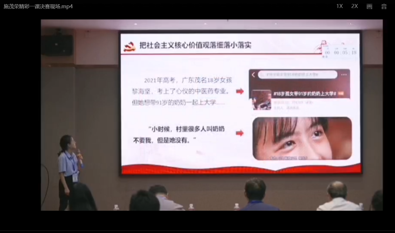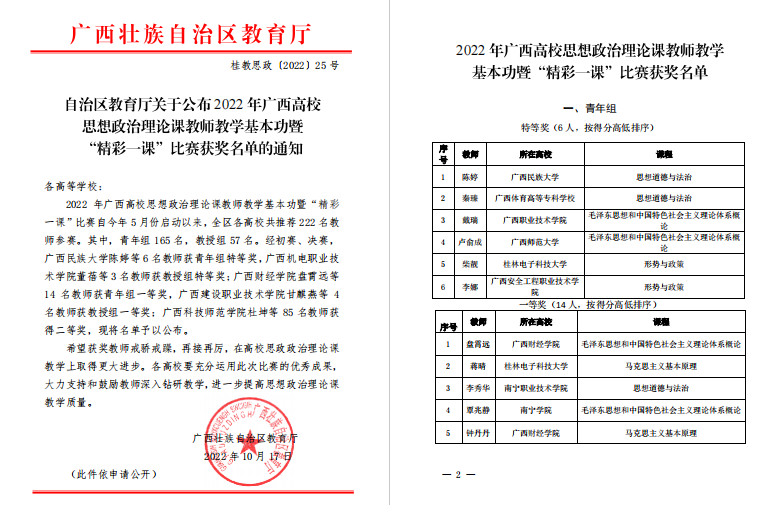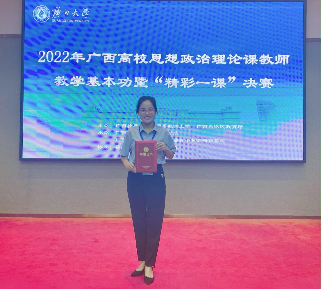 9月24日,2022年广西高校思想政治理论课教师教学基本功暨“精彩一课”评选活动决赛在广西大学举行,我校马克思主义学院教师施茂荣荣获青年组一等奖。