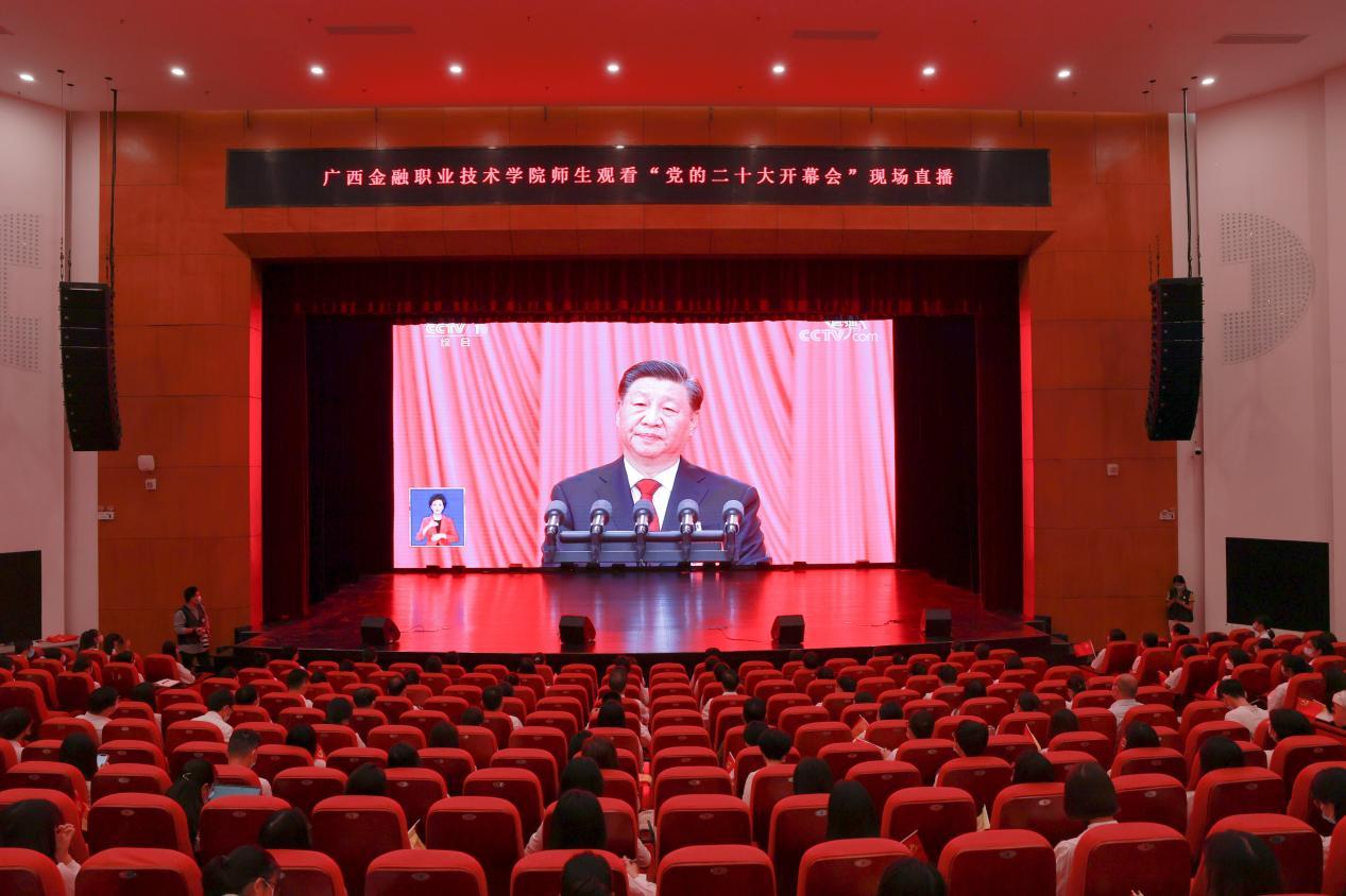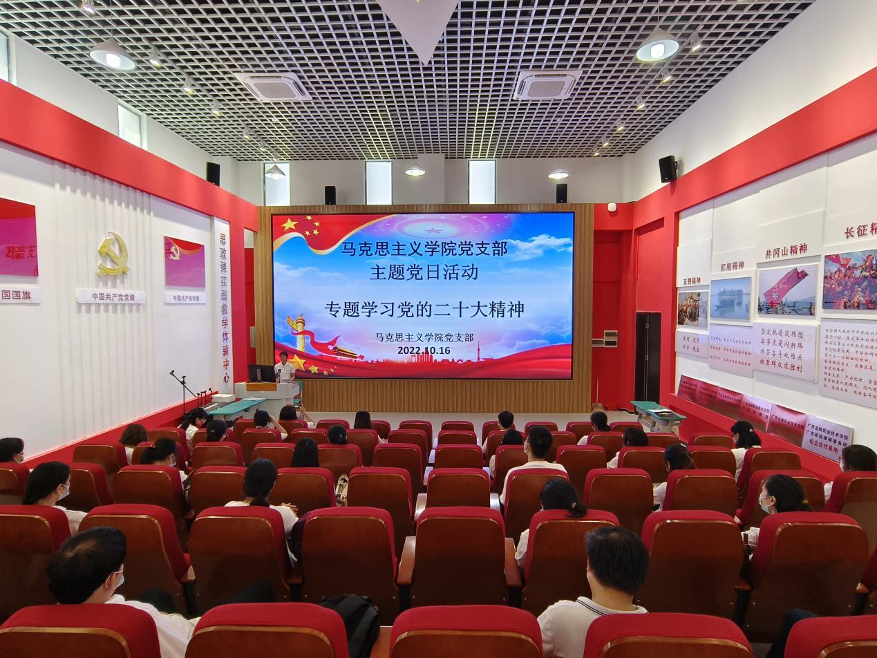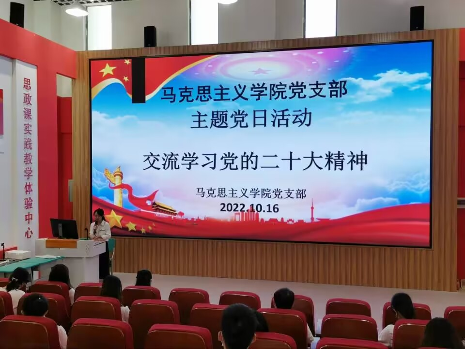 马克思主义学院党支部全体党员教师与学校领导、党员教师及学生代表在西校区国际会议中心齐聚一堂,共同收看开幕会。会场内气氛热烈,师生们共同挥舞着党旗、国旗和校旗,热烈庆祝党的二十大胜利召开。