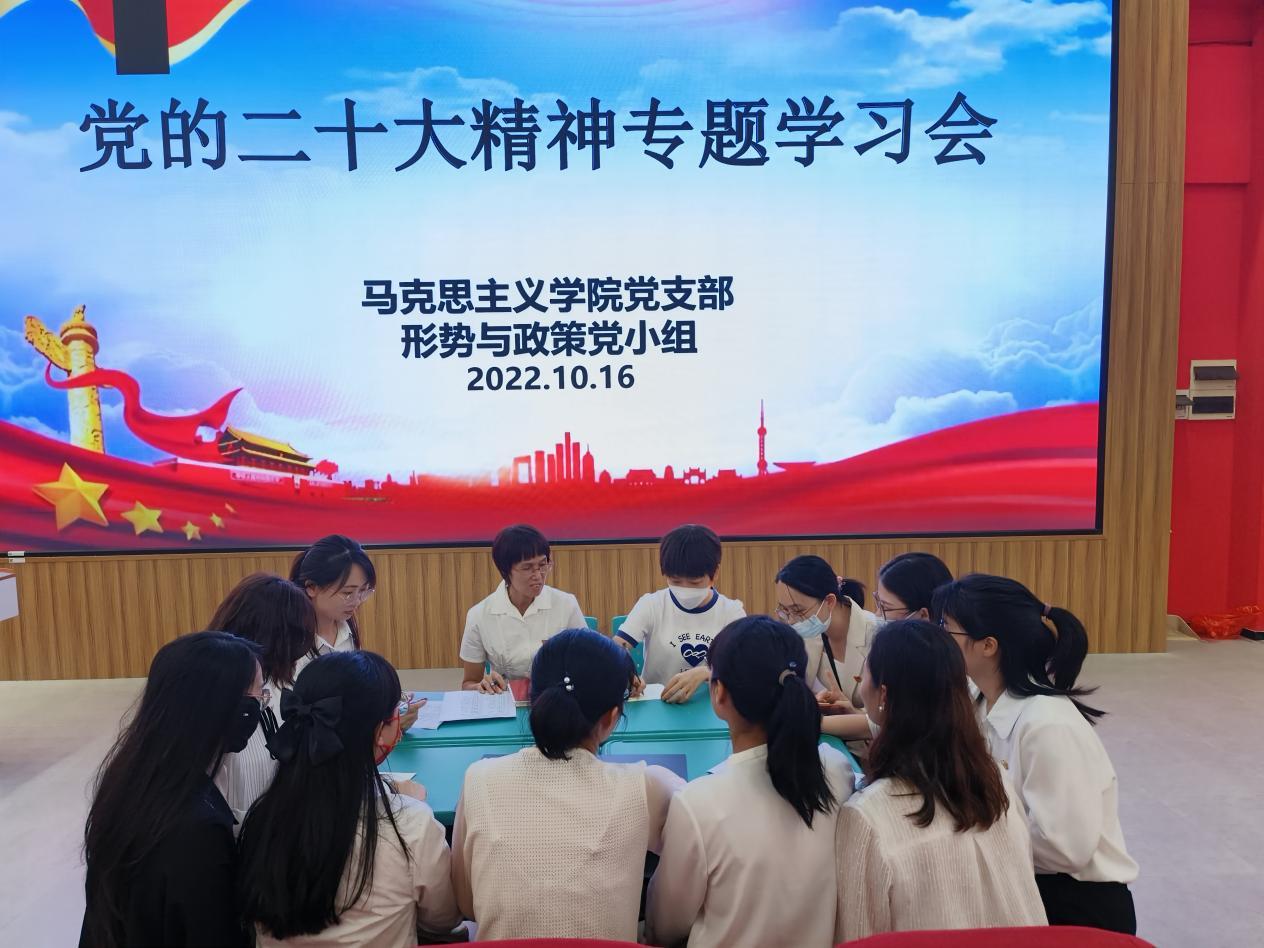 开幕会后,马克思主义学院党支部迅速组织支部全体党员在西校区思政虚拟仿真中心(3#B101)开展学习党的二十大精神主题党日活动,交流学习党的二十大精神;各党小组也及时开展党的二十大精神专题学习。大家纷纷表示心潮澎湃、深受鼓舞,积极分享了自己的心得体会,会后并积极撰写心得感想。