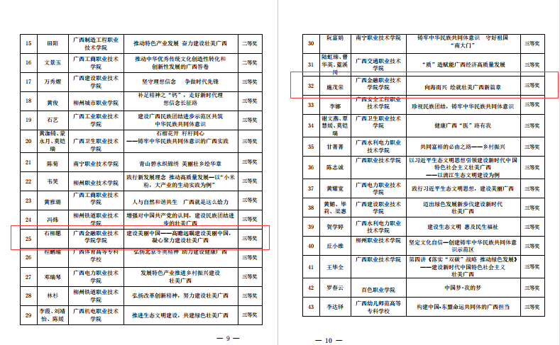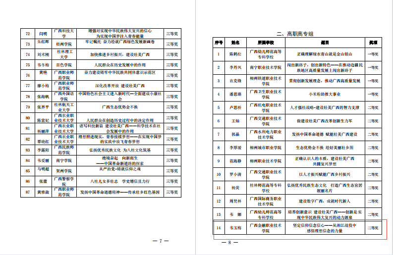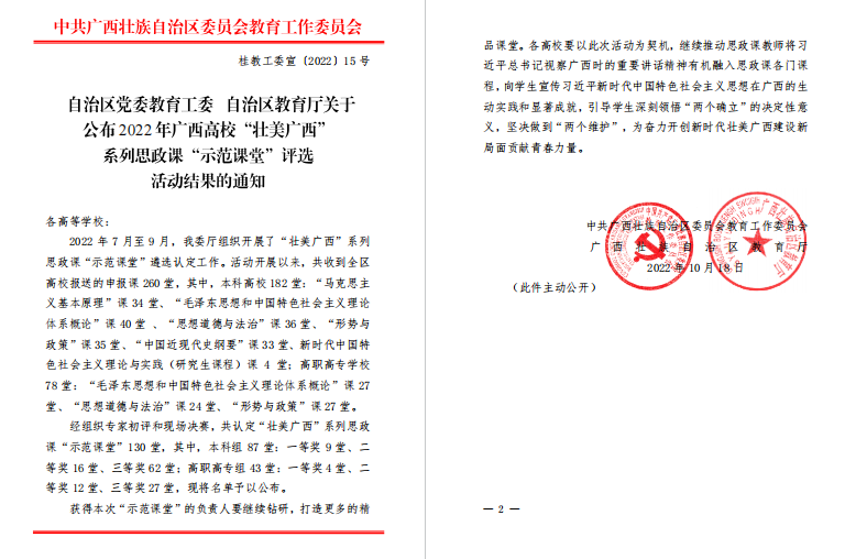 9月15日,由中共广西壮族自治区委员会教育工作委员会、广西壮族自治区教育厅主办的2022年广西高校建设“壮美广西”系列思政课“示范课堂”评选活动决赛在柳州职业技术学院举行,我校马克思主义学院韦玉梅老师在决赛中荣获二等奖,施茂荣及石柳愿老师获得三等奖。