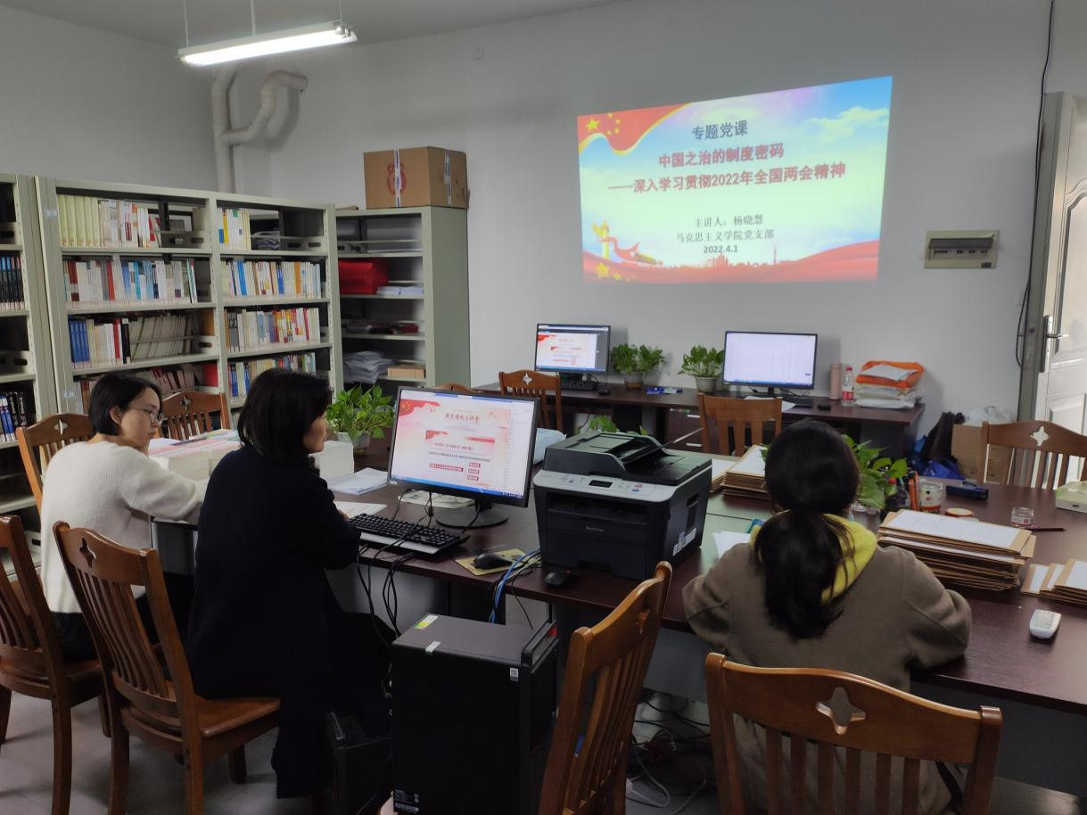 为深入学习贯彻2022年全国“两会”精神,4月1日下午,马克思主义学院党支部组织支部全体党员在行政楼612通过周末理论大讲堂平台学习由全国政协委员、东北师范大学党委书记杨晓慧主讲的《中国之治的制度密码——深入学习贯彻2022年全国两会精神》主题党课。