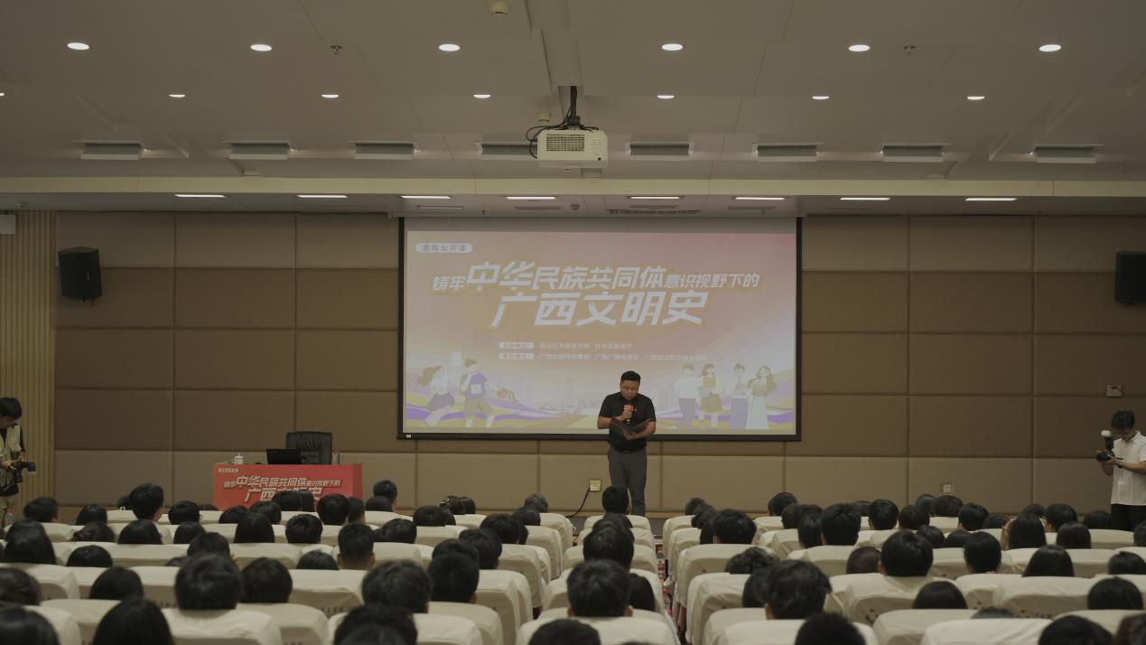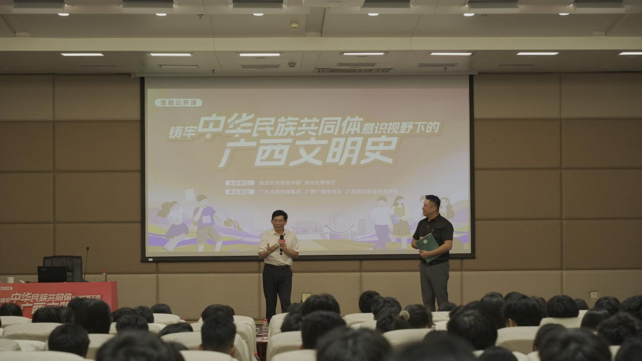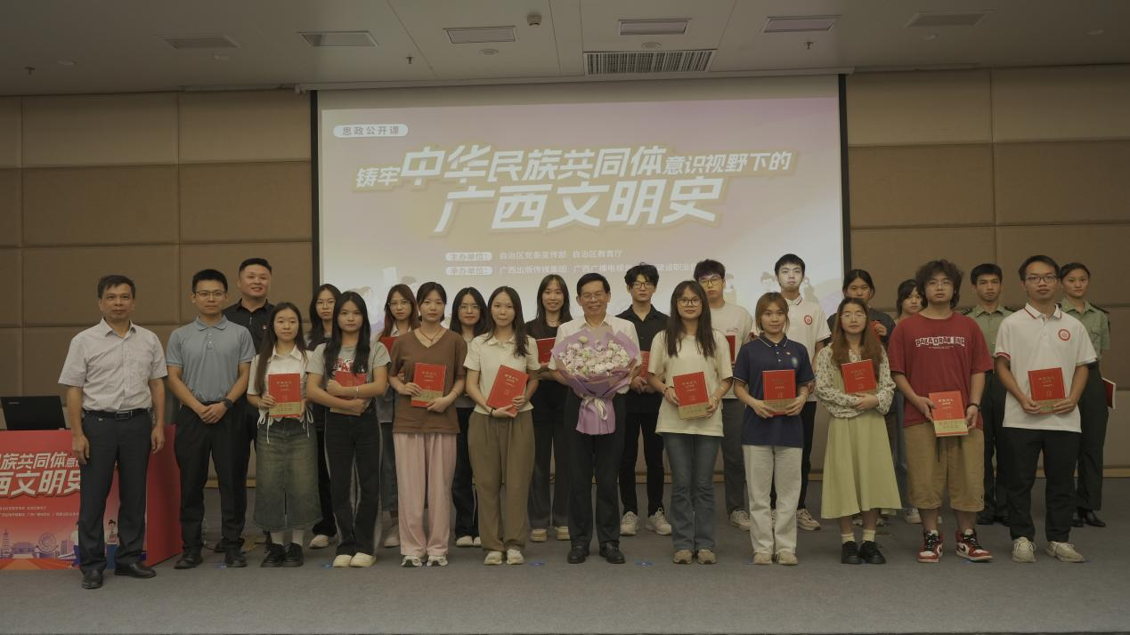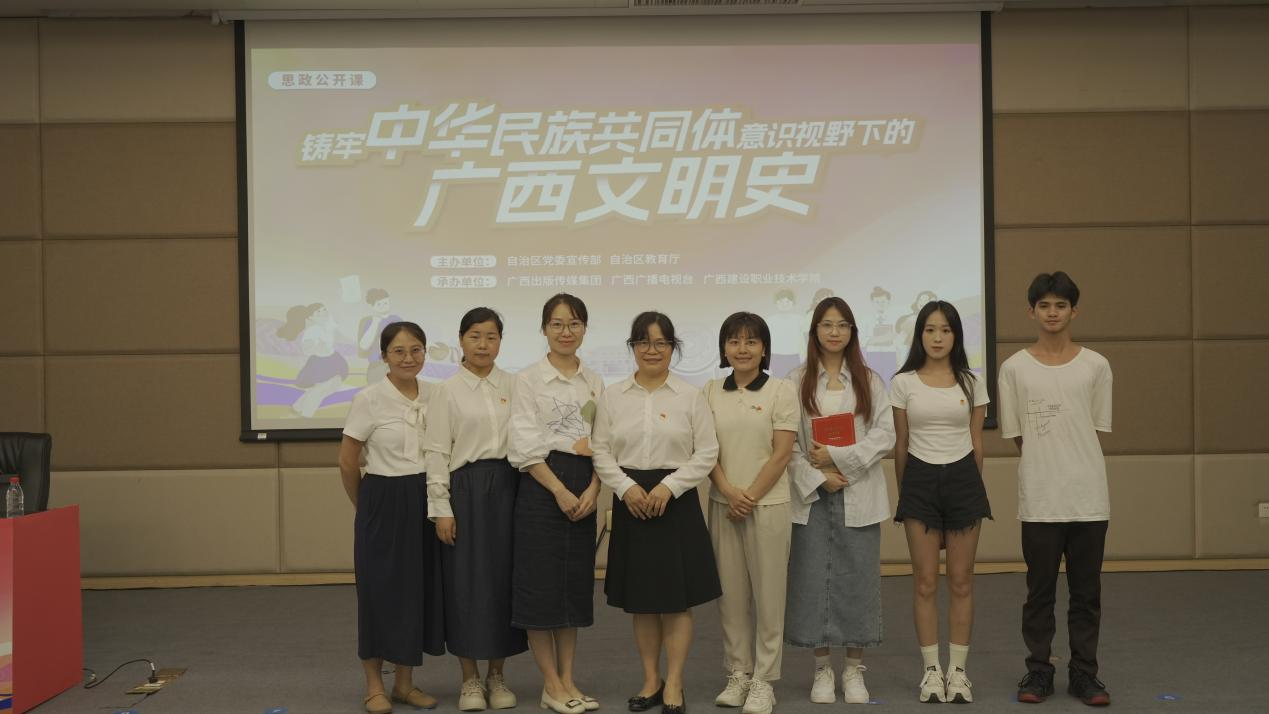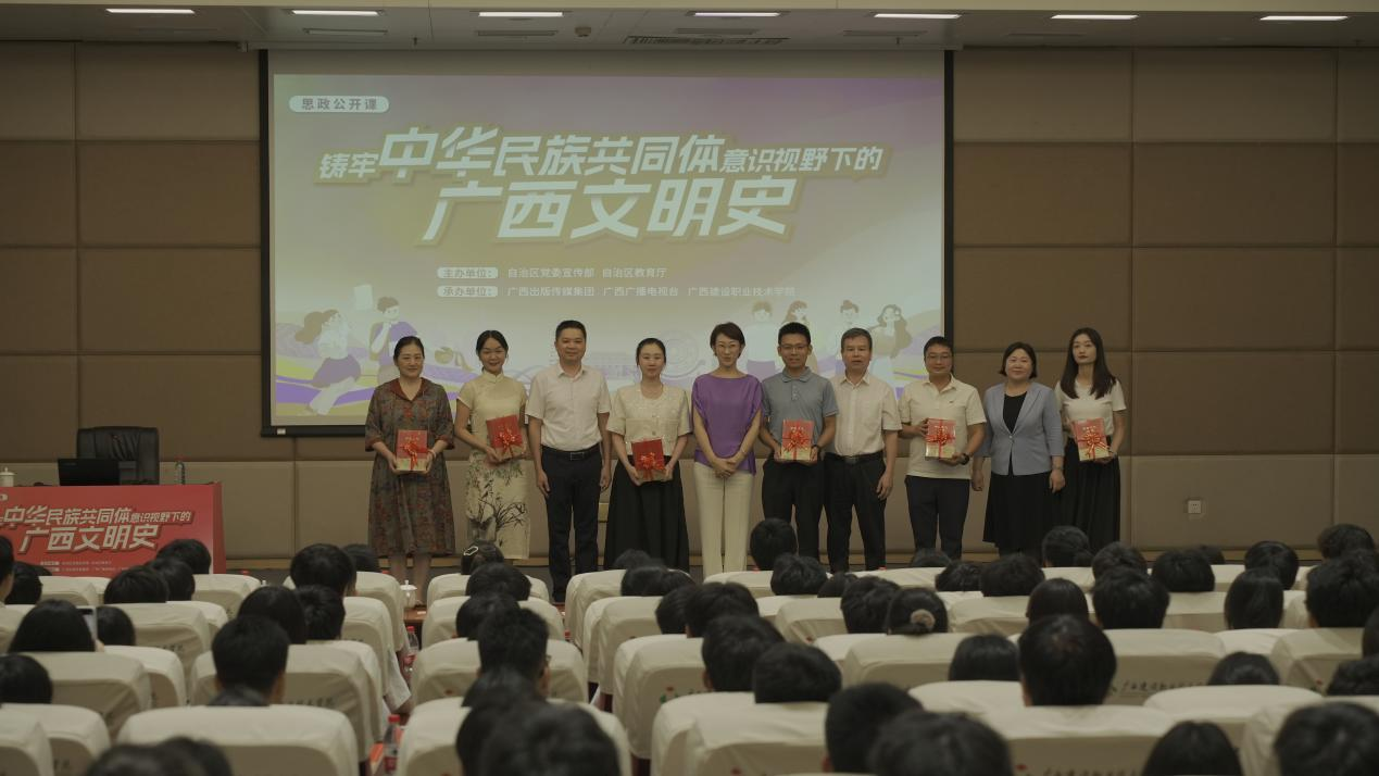 7月4日下午,由自治区党委宣传部、自治区教育厅主办,广西出版传媒集团、广西广播电视台、广西建设职业技术学院承办的“铸牢中华民族共同体意识视野下的广西文明史”思政公开课在广西建设职业技术学院举行。我校党委委员、宣传部副部长韩蓓丽、马克思主义学院副院长韦思密组织带领马克思主义学院14名教师代表及40名学生代表到场聆听。