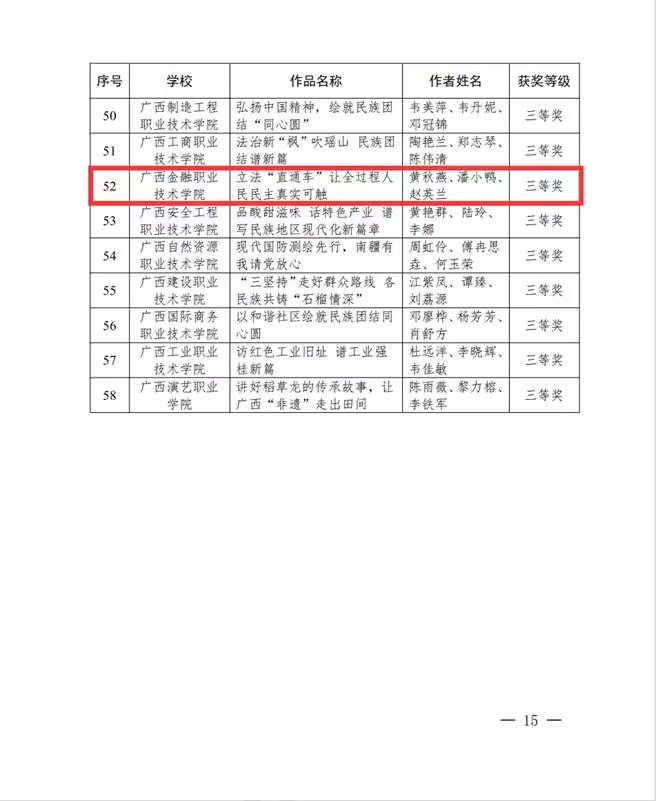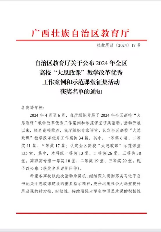 近日,自治区教育厅关于公布2024年全区高校“大思政课”教学改革优秀工作案例和示范课堂征集活动获奖名单,我院参评作品《石榴花开在社区 团结同心共进步》和《立法“直通车”让全过程人民民主真实可触》获自治区级示范课堂三等奖。