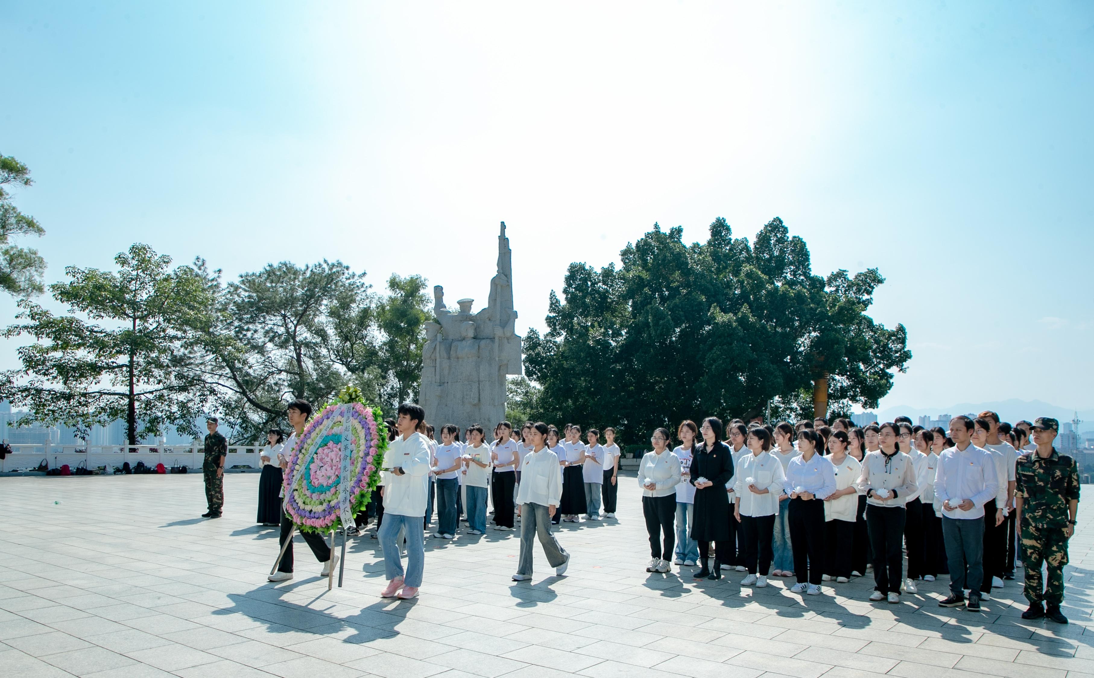 我校师生怀着对革命先辈无限的敬仰与怀念,亲手制作白花,来到百色起义纪念碑,紧随花圈手其后,向革命烈士献花。在庄严肃穆的悼念现场,全场肃立默哀,表达对红军战士们的崇敬之情。