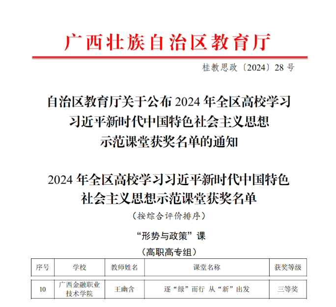近日,广西壮族自治区教育厅公布2024年全区高校学习习近平新时代中国特色社会主义思想示范课堂获奖名单,我校马克思主义学院教师王幽含在“形势与政策”课(高职高专组)中荣获三等奖的好成绩。