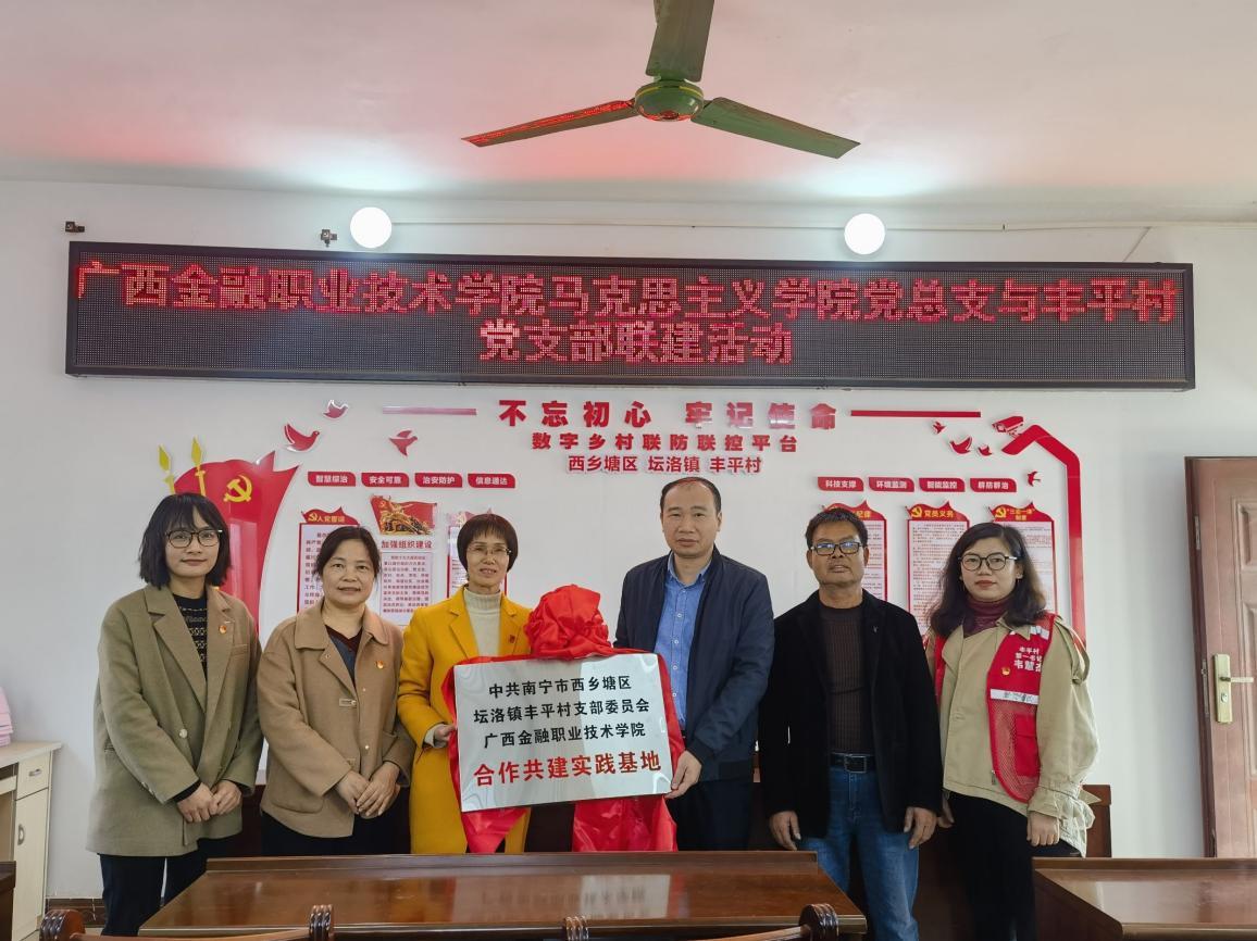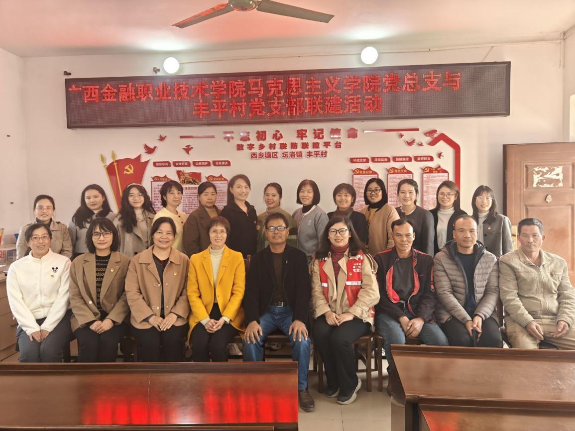 为贯彻落实党的二十大和二十届三中全会精神,进一步加强新形势下基层党组织建设,充分发挥全国党建工作样板支部培育创建单位的引领和带动作用,2025年1月16日下午,广西金融职业技术学院马克思主义学院党总支和南宁市西乡塘区坛洛镇丰平村党支部开展了主题为“支部联建,互助发展”的联建活动。西乡塘区委组织部曾广源副部长、马克思主义学院党总支书记兰晓黎、副书记韦思密、坛洛镇丰平村驻村第一书记韦慧杰、丰平村党支部副书记卢仕安及其它党员同志共计20余人参加本次活动。
