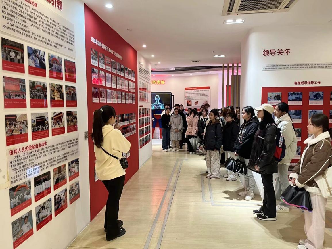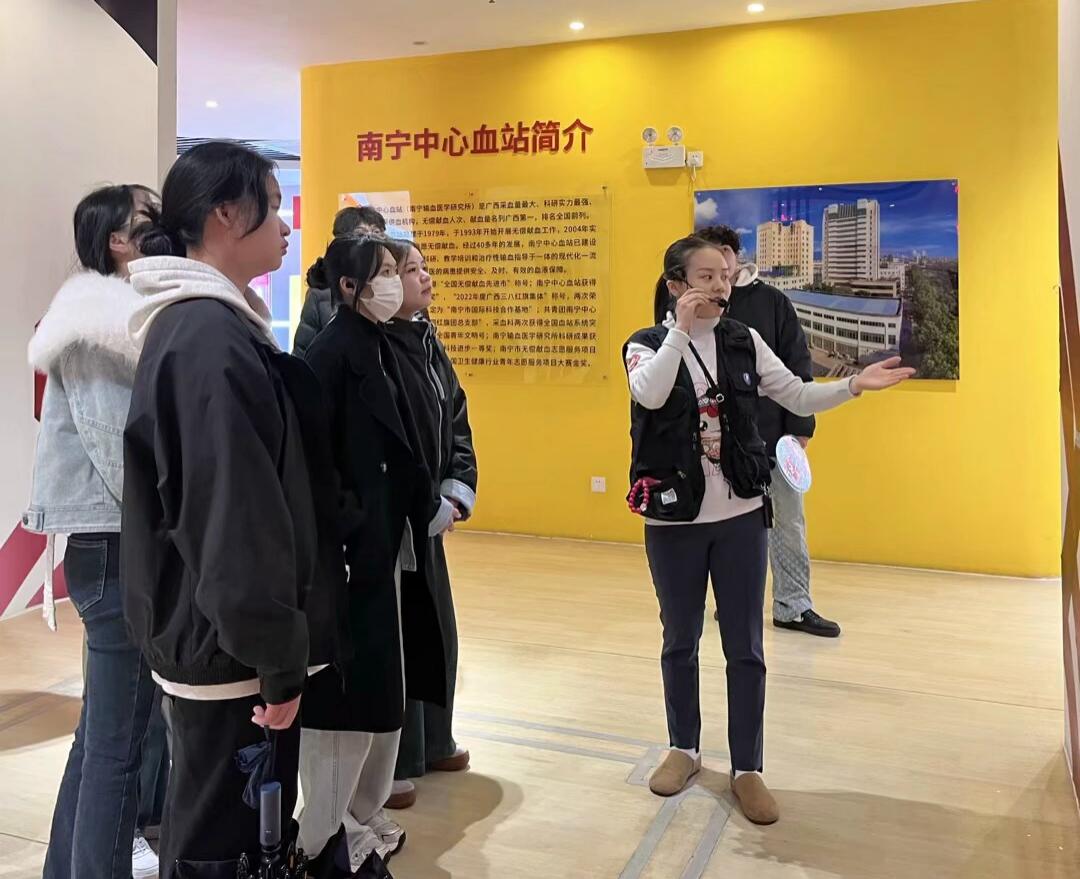 立身百行,以学为先。在南宁血站展示厅,我校师生参观了科普展示,学习了解了血站的发展历程、输血的发展简史,深刻感受我国大力推行无偿献血、提高公众无偿献血意识的重大意义。我校马克思主义学院党员教师黄秋燕在展馆现场进行了现场教学,让师生充分了解无偿献血的推广不仅能够保障血液充足供应,还弘扬了社会团结互助的精神,引导师生进一步增强社会责任感和公益意识。