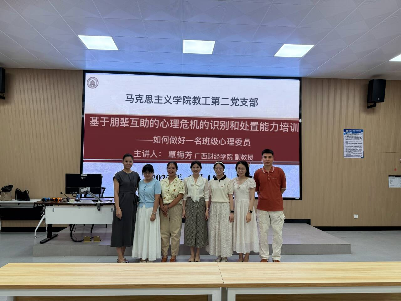 为深入贯彻落实习近平总书记关于“大思政课”建设的重要指示精神,全面落实立德树人根本任务,马克思主义学院教工第二党支部坚持党建引领,于6月11日牵头举办“阳光心理大讲堂——大学生心理危机识别与干预能力提升”专题培训。活动特邀广西财经学院心理中心覃梅芳副教授主讲,全校班级心理委员参加。