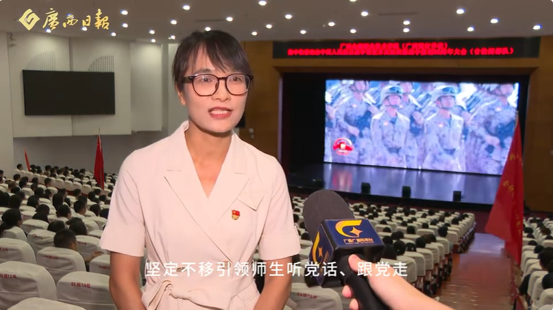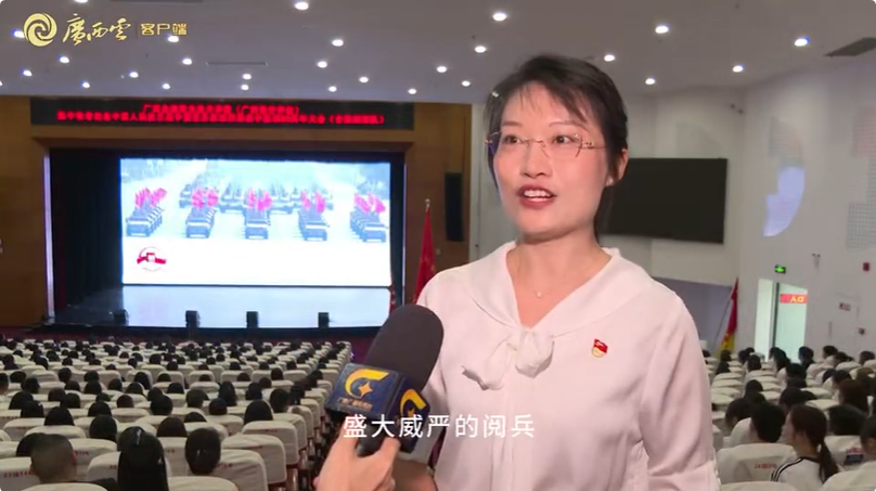 马克思主义学院教工第二党支部书记容迪接受了广西电视台的采访,她表示观看盛大阅兵,铭记抗战历史,强大的人民军队深刻昭示:党的领导是事业发展的根本保证。我们党员教师应深入学习,把伟大抗战精神融入支部建设和立德树人全过程,坚定不移引领师生听党话、跟党走,为实现中华民族伟大复兴贡献力量。