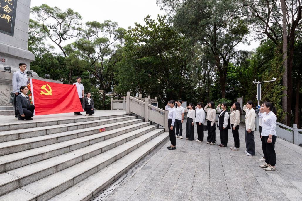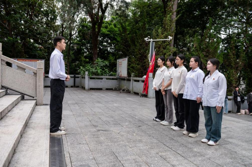 教师党员重温入党誓词,马克思主义学院副院长容迪同志现场讲授思政微课,她指出,青年肩负着民族复兴的伟大使命,此次研学活动,就是要让大家在边疆热土上感悟初心使命,把爱国情、强国志、报国行融入血脉,为广西高质量发展贡献力量。
