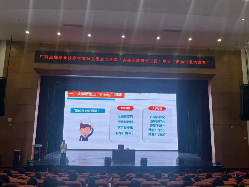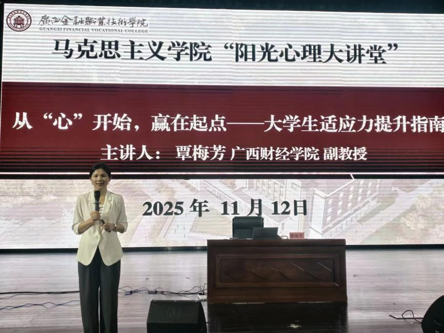 为落实立德树人根本任务,着力推动构建我校“大思政课”育人格局,帮助2025级新生更好适应大学生活,树立科学的心理健康观念,2025年11月12日晚,马克思主义学院在国际会议中心举办“阳光心理大讲堂”专题讲座。广西财经学院覃梅芳副教授应邀作题为《心光领航,适应有方——大学生适应力提升指南》的专题讲座,全校近千名学生聆听了讲座。