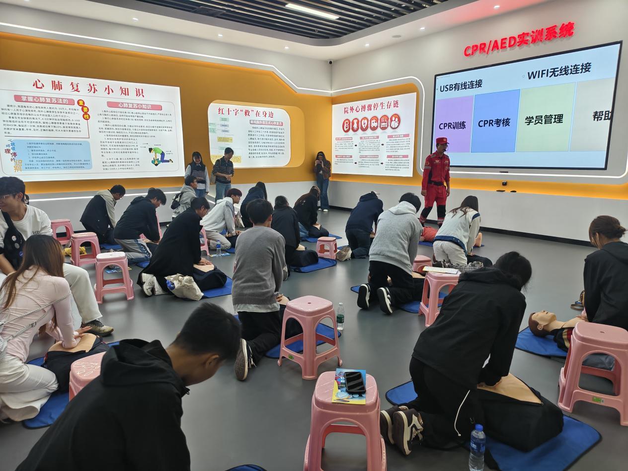 本次活动的核心环节——“安全守护,生命同行”应急安全实践课程,为师生带来了一场“沉浸式”安全技能培训。课程涵盖VR电动自行车体验、公交车逃生模拟、模拟驾驶、沉浸式灭火、烟雾逃生、建筑结构抗震演示防踩踏、心肺复苏急救法、电梯坠落体感互动、气道异物梗阻急救法、徒手搬运简易担架制作等10余项实操内容。