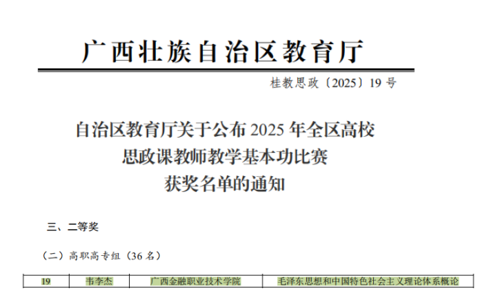 近日,2025年全区高校思政课教师教学基本功比赛评选结果揭晓。我校马克思主义学院青年教师韦李杰在“毛泽东思想和中国特色社会主义理论体系概论”课(高职高专组)赛项中荣获全区二等奖。