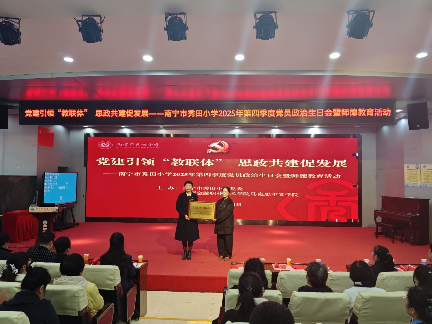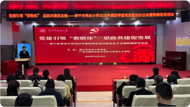 12月24日下午,南宁市秀田小学与广西金融职业技术学院马克思主义学院联合举办了“党建引领‘教联体’,思政共建促发展”第四季度党员政治生日会暨师德教育活动。广西金融职业技术学院马克思主义学院党员教师代表与秀田小学全体教职工齐聚一堂,共话协同育人,共庆政治生日。
